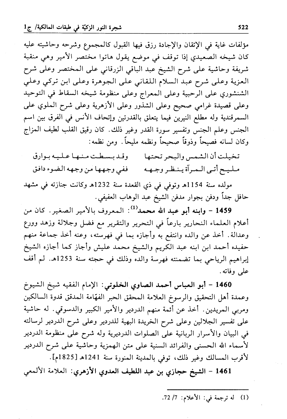 1460 - أبو العباس أحمد الصاوي الخلوتي: الإمام الفقيه شيخ الشيوخ وعمدة أهل التحقيق والرسوخ العلامة المحقق الحبر الفهّامة المدقق قدوة السالكين ومربي المريدين. أخذ عن أئمة منهم الدردير والأمير الكبير والدسوقي. له حاشية على تفسير الجلالين وعلى شرح الخريدة البهية للدردير وعلى شرح الدردير لرسالته في البيان والأسرار الربانية على الصلوات الدرديرية وله شرح على منظومة الدردير لأسماء الله الحسنى والفرائد السنية على متن الهمزية وحاشية على شرح الدردير لأقرب المسالك وغير ذلك، توفي بالمدينة المنورة سنة 1241 هـ[1825 م].