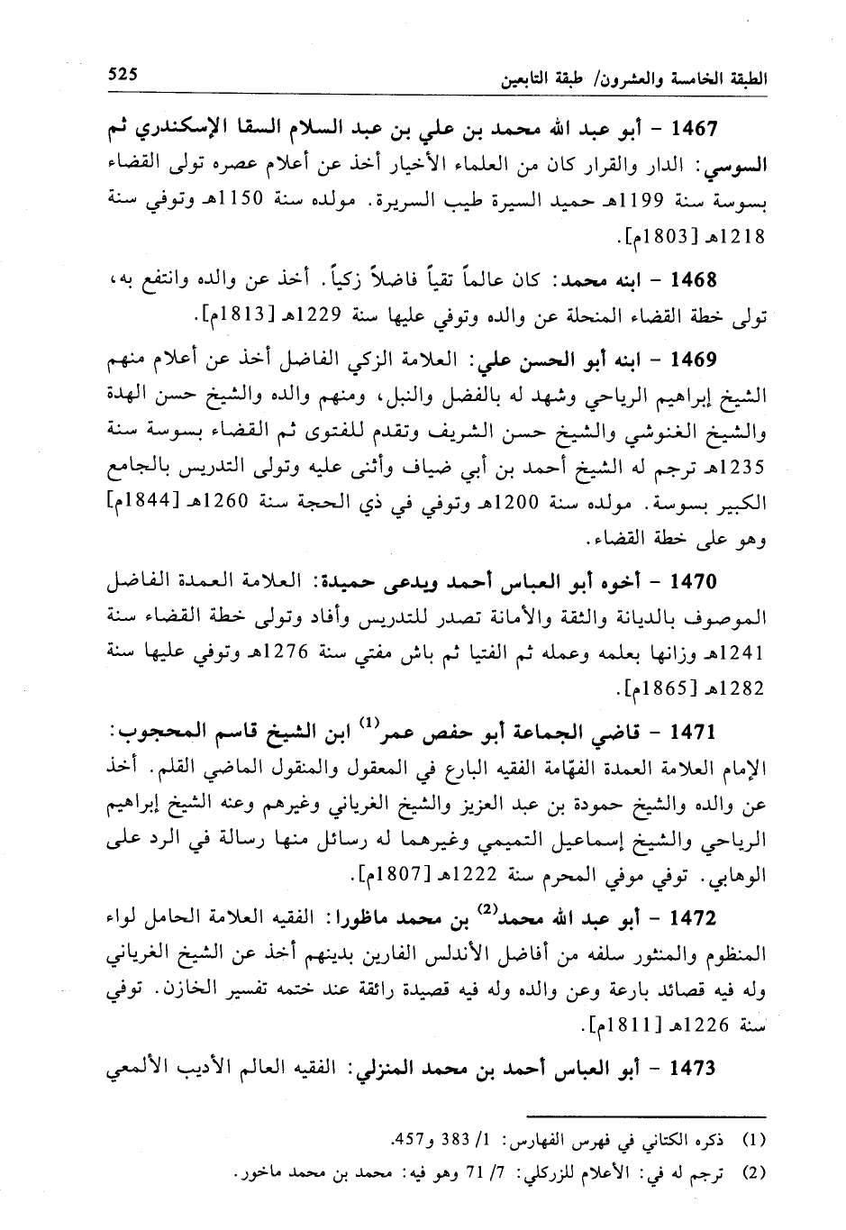 1467 - أبو عبد الله محمد بن علي بن عبد السلام السقا الإسكندري ثم السوسي: الدار والقرار كان من العلماء الأخيار أخذ عن أعلام عصره تولى القضاء بسوسة سنة 1199 هـ حميد السيرة طيب السريرة. مولده سنة 1150 هـ وتوفي سنة 1218 هـ[1803 م].