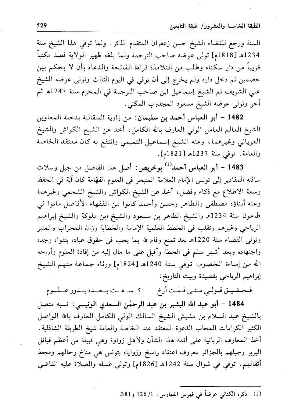 1483 - أبو العباس أحمد بوخريص: أصل هذا الفاضل من جبل وسلات ساقته المقادير إلى تونس الإمام العلامة المتبحر في العلوم الفهّامة كان آية في الحفظ وسعة الاطلاع مع ذكاء وفضل، أخذ عن الشيخ الكواش والشيخ الشحمي وغيرهما وعنه أبناؤه مصطفى والطاهر وحسن وأحمد كانوا من الفقهاء الأفاضل ماتوا في طاعون سنة 1234 هـ والشيخ الطاهر بن مسعود والشيخ ابن ملوكة والشيخ إبراهيم الرياحي وغيرهم وتقلب في الخطط العلمية الإمامة والخطابة وزان المحراب والمنبر وتولى القضاء سنة 1220 هـ بعد تمنع وقام لله بما يجب في حقوق عباده بتقواه وجده واجتهاده وبعد أشهر سلم في الخطة وأقبل على ما مال إليه من إفادة العلوم وأراحه الله من إساءة الخصوم. توفي سنة 1240 هـ[1824 م] ورثاه جماعة منهم الشيخ إبراهيم الرياحي بقصيدة وبيت التاريخ: