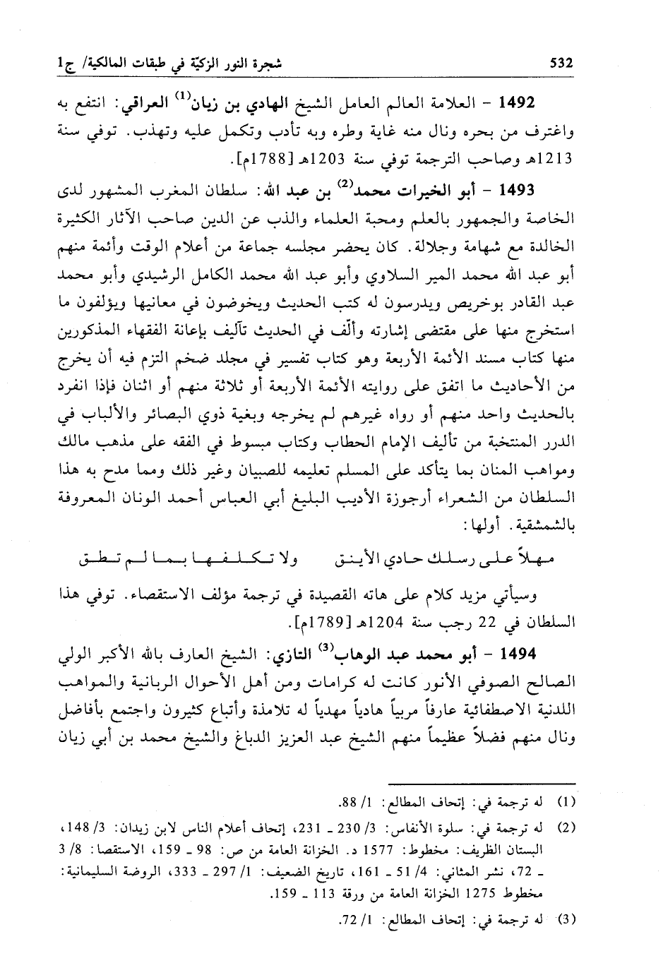 1492 - العلامة العالم العامل الشيخ الهادي بن زيان العراقي: انتفع به واغترف من بحره ونال منه غاية وطره وبه تأدب وتكمل عليه وتهذب. توفي سنة 1213هـ وصاحب الترجمة توفي سنة 1203 هـ[1788م].