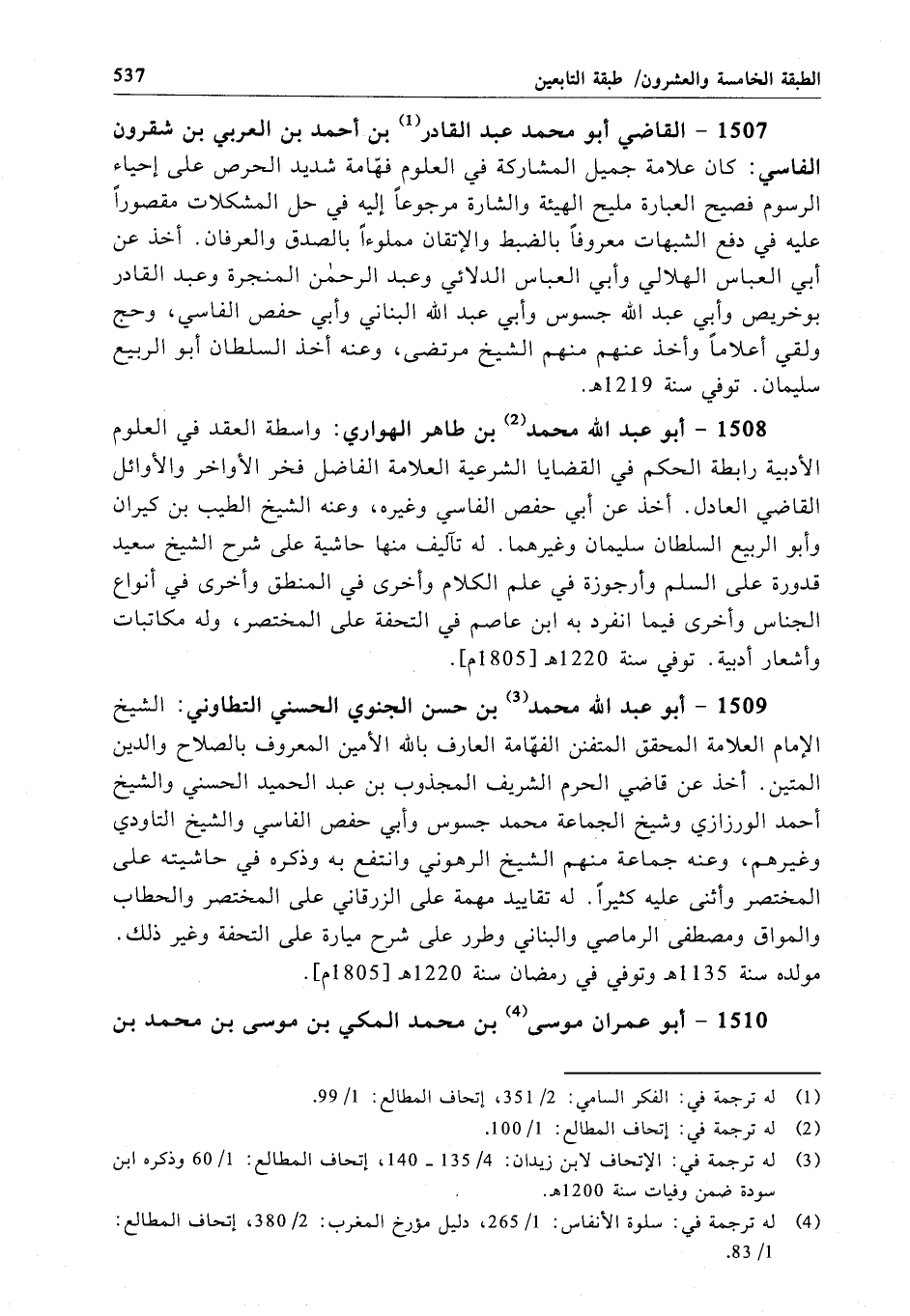 1508 - أبو عبد الله محمَّد بن طاهر الهواري: واسطة العقد في العلوم الأدبية رابطة الحكم في القضايا الشرعية العلامة الفاضل فخر الأواخر والأوائل القاضي العادل. أخذ عن أبي حفص الفاسي وغيره، وعنه الشيخ الطيب بن كيران وأبو الربيع السلطان سليمان وغيرهما. له تآليف منها حاشية على شرح الشيخ سعيد قدورة على السلم وأرجوزة في علم الكلام وأخرى في المنطق وأخرى في أنواع الجناس وأخرى فيما انفرد به ابن عاصم في التحفة على المختصر، وله مكاتبات وأشعار أدبية. توفي سنة 1220هـ[1805م].