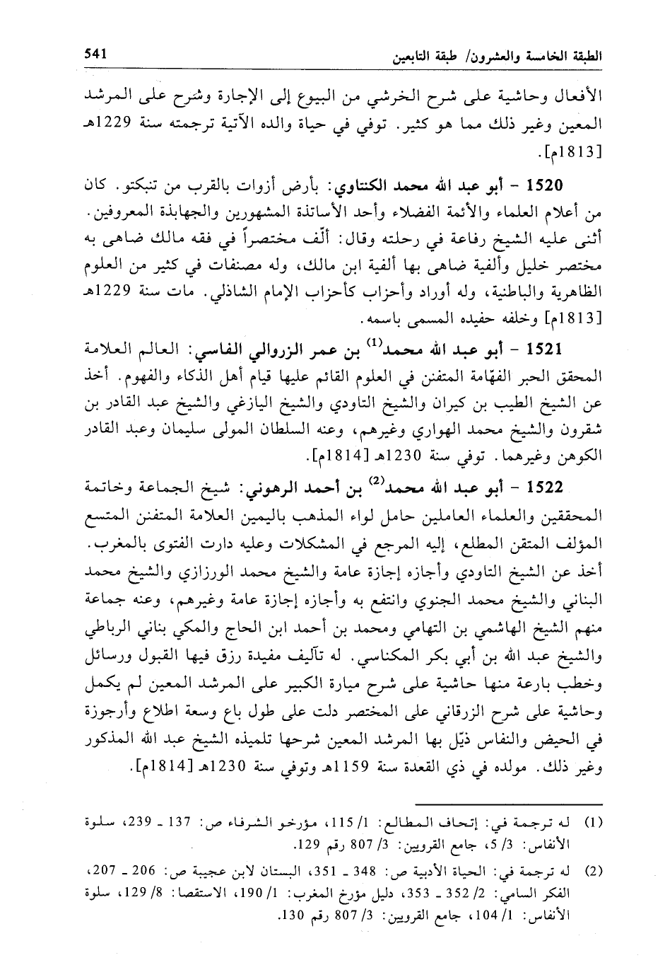 1522 - أبو عبد الله محمَّد بن أحمد الرهوني: شيخ الجماعة وخاتمة المحققين والعلماء العاملين حامل لواء المذهب باليمين العلامة المتفنن المتسع المؤلف المتقن المطلع، إليه المرجع في المشكلات وعليه دارت الفتوى بالمغرب. أخذ عن الشيخ التاودي وأجازه إجازة عامة والشيخ محمَّد الورزازي والشيخ محمَّد البناني والشيخ محمَّد الجنوي وانتفع به وأجازه إجازة عامة وغيرهم، وعنه جماعة منهم الشيخ الهاشمي بن التهامي ومحمد بن أحمد ابن الحاج والمكي بناني الرباطي والشيخ عبد الله بن أبي بكر المكناسي. له تآليف مفيدة رزق فيها القبول ورسائل وخطب بارعة منها حاشية على شرح ميارة الكبير على المرشد المعين لم يكمل وحاشية على شرح الزرقاني على المختصر دلت على طول باع وسعة اطلاع وأرجوزة في الحيض والنفاس ذيّل بها المرشد المعين شرحها تلميذه الشيخ عبد الله المذكور وغير ذلك. مولده في ذي القعدة سنة 1159هـ وتوفي سنة 1230هـ[1814م].