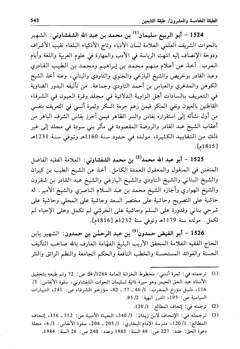 1524 - أبو الربيع سليمان بن محمَّد بن عبد الله الشفشاوني: الشهير بالحوات الشريف العلمي العلامة لسان الأدباء وتاج الأذكياء البلغاء نقيب الأشراف ودوحة الإنصاف إليه انتهت الرياسة في الأدب والمهارة في علوم العربية واللغة وأيام العرب. أخذ عن أعلام منهم محمَّد بن إبراهيم ومحمد بن الطيب القادري وعبد القادر بوخريص والشيخ اليازغي والجنوي والتاودي والبناني، وعنه أخذ الشيخ الكوهن والمدغري والعباس بن أحمد التاودي وجماعة. من تأليفه البدور الضاوية في التعريف بالسادات أهل الزاوية الدلائية في مجلد وقرة العيون في الشرفاء القاطنين بالعيون ونفي المنكر فيمن زعم حرمة السكر وثمرة أنسي في التعريف بنفسي من أول نشأته إلى استقراره بفاس والسر الظاهر فيمن أحرز بفاس الشرف الباهر من أعقاب الشيخ عبد القادر والروضة المقصودة في مآثر بني سودة في مجلد إلى غير ذلك من التقاييد الكثيرة، مولده في حدود سنة 1160هـ وتوفي سنة 1231هـ[1815م].