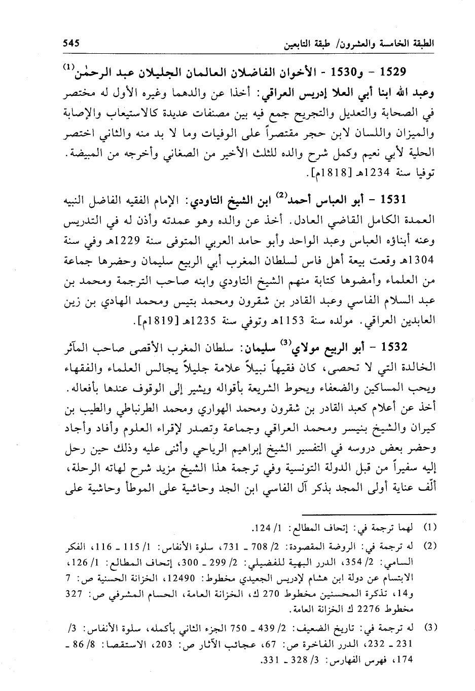 1532 - أبو الربيع مولاي سليمان: سلطان المغرب الأقصى صاحب المآثر الخالدة التي لا تحصى، كان فقيهاً نبيلاً علامة جليلاً يجالس العلماء والفقهاء ويحب المساكين والضعفاء ويحوط الشريعة بأقواله ويشير إلى الوقوف عندها بأفعاله. أخذ عن أعلام كعبد القادر بن شقرون ومحمد الهواري ومحمد الطرنباطي والطيب بن كيران والشيخ بنيسر ومحمد العراقي وجماعة وتصدر لإقراء العلوم وأفاد وأجاد وحضر بعض دروسه في التفسير الشيخ إبراهيم الرياحي وأثنى عليه وذلك حين رحل إليه سفيراً من قبل الدولة التونسية وفي ترجمة هذا الشيخ مزيد شرح لهاته الرحلة، ألّف عناية أولى المجد بذكر آل الفاسي ابن الجد وحاشية على الموطأ وحاشية على