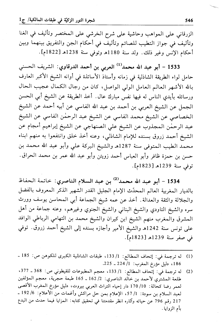 1533 - أبو عبد الله محمَّد العربي بن أحمد الدرقاوي: الشريف الحسني حامل لواء الطريقة الشاذلية في زمانه وأستاذ الأساتذة في أوانه الشيخ الأكبر العارف بالله الأشهر العالم العامل الولي الواصل، كان من رجال الكمال عجيب الحال ورسائله بأيدي الناس له فيها نفس مبارك عال. أخذ الطريقة عن الشيخ أبي الحسن الجمل عن الشيخ العربي بن أحمد بن عبد الله الفاسي عن أبيه أحمد عن الشيخ الخصاصي عن الشيخ محمَّد الفاسي عن الشيخ عبد الرحمن الفاسي عن الشيخ عبد الرحمن المجذوب عن الشيخ علي الصنهاجي عن الشيخ إبراهيم أمجام عن الشيخ أحمد زروق بسنده للإمام الشاذلي، وعنه أخذ خلق وانتفعوا به منهم ابناه محمَّد الطيب المتوفى سنة 1287هـ والشيخ البركة علي وأبو عبد الله محمَّد بن حسن بن حمزة ظافر وأبو العباس أحمد زويتن وأبو عبد الله عمر بن محمَّد الحراق. توفي سنة 1239هـ[1823م].