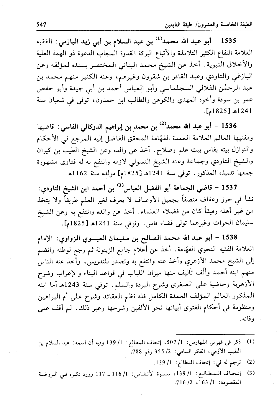 1537 - قاضي الجماعة أبو الفضل العباس بن أحمد ابن الشيخ التاودي: نشأ في حرز وعفاف متصفاً بجميل الأوصاف لا يعرف لغير العلم طريقاً ولا يتخذ من غير أهله رفيقاً كان من فضلاء العلماء. أخذ عن والده وانتفع به وعن الشيخ سليمان الحوات وغيرهما تولى قضاء فاس. وتوفي سنة 1241هـ[1825م].
