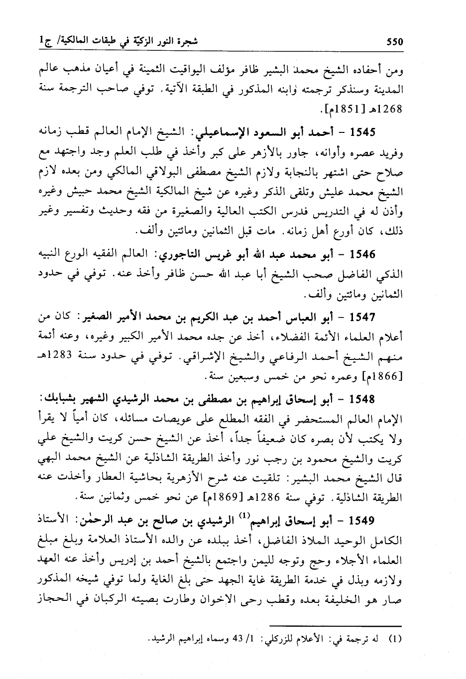 1549 - أبو إسحاق إبراهيم الرشيدي بن صالح بن عبد الرحمن: الأستاذ الكامل الوحيد الملاذ الفاضل، أخذ ببلده عن والده الأستاذ العلامة وبلغ مبلغ العلماء الأجلاء وحج وتوجه لليمن واجتمع بالشيخ أحمد بن إدريس وأخذ عنه العهد ولازمه وبذل في خدمة الطريقة غاية الجهد حتى بلغ الغاية ولما توفي شيخه المذكور صار هو الخليفة بعده وقطب رحى الاخوان وطارت بصيته الركبان في الحجاز