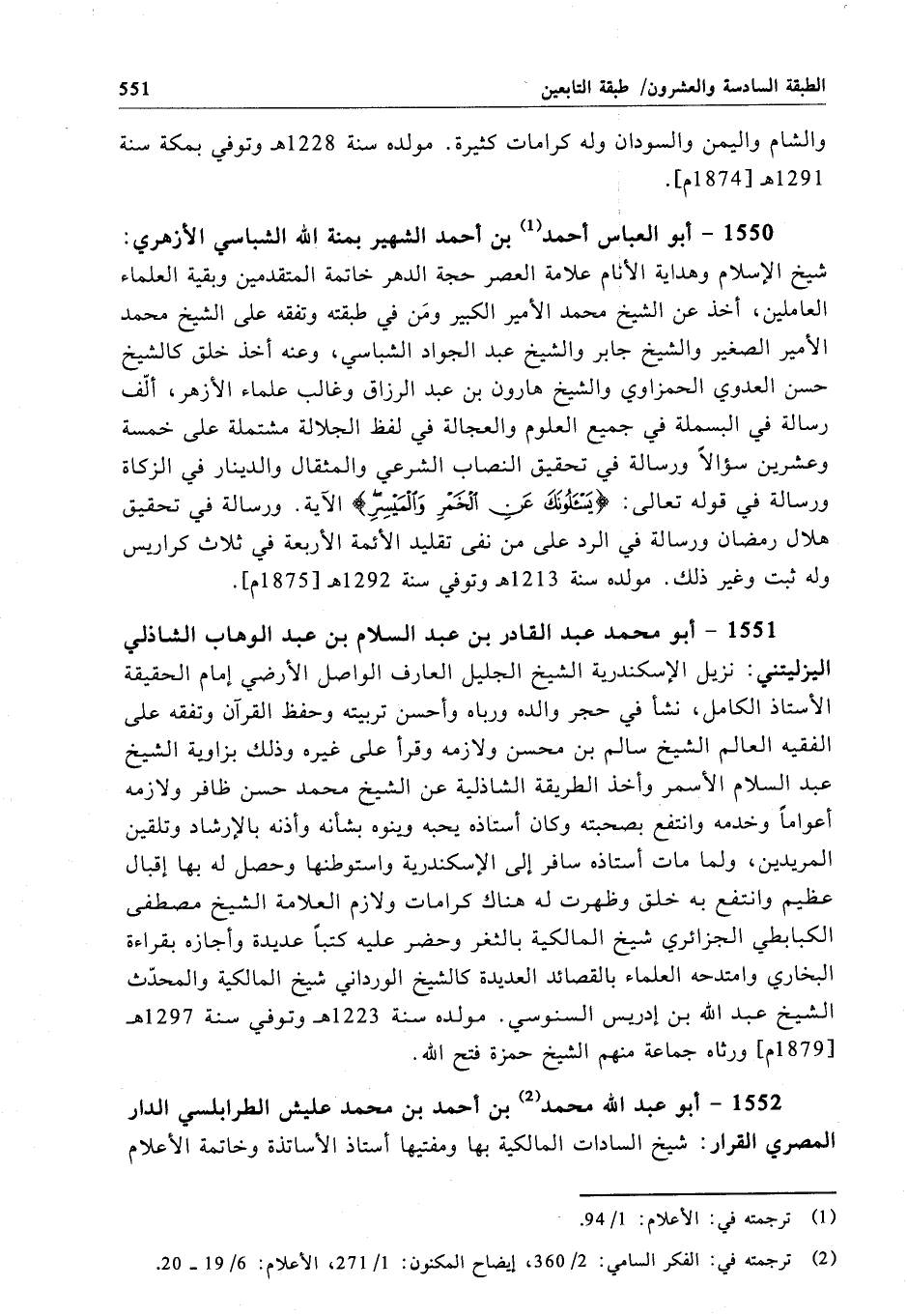 1551 - أبو محمَّد عبد القادر بن عبد السلام بن عبد الوهاب الشاذلي اليزليتني: نزيل الإسكندرية الشيخ الجليل العارف الواصل الأرضي إمام الحقيقة الأستاذ الكامل، نشأ في حجر والده ورباه وأحسن تربيته وحفظ القرآن وتفقه على الفقيه العالم الشيخ سالم بن محسن ولازمه وقرأ على غيره وذلك بزاوية الشيخ عبد السلام الأسمر وأخذ الطريقة الشاذلية عن الشيخ محمَّد حسن ظافر ولازمه أعواماً وخدمه وانتفع بصحبته ولما مات أستاذه يحبه وينوه بشأنه وأذنه بالإرشاد وتلقين المريدين، ولما مات أستاذه سافر إلى الإسكندرية واستوطنها وحصل له بها إقبال عظيم وانتفع به خلق وظهرت له هناك كرامات ولازم العلامة الشيخ مصطفى الكبابطي الجزائري شيخ المالكية بالثغر وحضر عليه كتباً عديدة وأجازه بقراءة البخاري وامتدحه العلماء بالقصائد العديدة كالشيخ الورداني شيخ المالكية والمحدّث الشيخ عبد الله بن إدريس السنوسي. مولده سنة 1223هـ وتوفي سنة 1297هـ[1879م]، ورثاه جماعة منهم الشيخ حمزة فتح الله.
