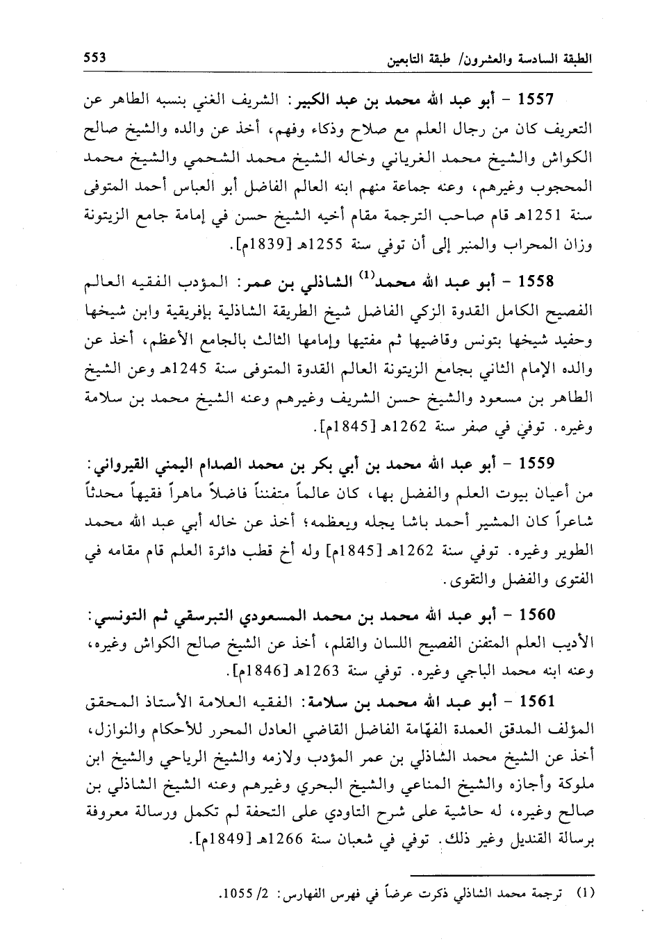 1558 - أبو عبد الله محمَّد الشاذلي بن عمر: المؤدب الفقيه العالم الفصيح الكامل القدوة الزكي الفاضل شيخ الطريقة الشاذلية بإفريقية وابن شيخها وحفيد شيخها بتونس وقاضيها ثم مفتيها وإمامها الثالث بالجامع الأعظم، أخذ عن والده الإِمام الثاني بجامع الزيتونة العالم القدوة المتوفى سنة 1245 هـ وعن الشيخ الطاهر بن مسعود والشيخ حسن الشريف وغيرهم وعنه الشيخ محمَّد بن سلامة وغيره. توفي في صفر سنة 1262 هـ[1845 م].
