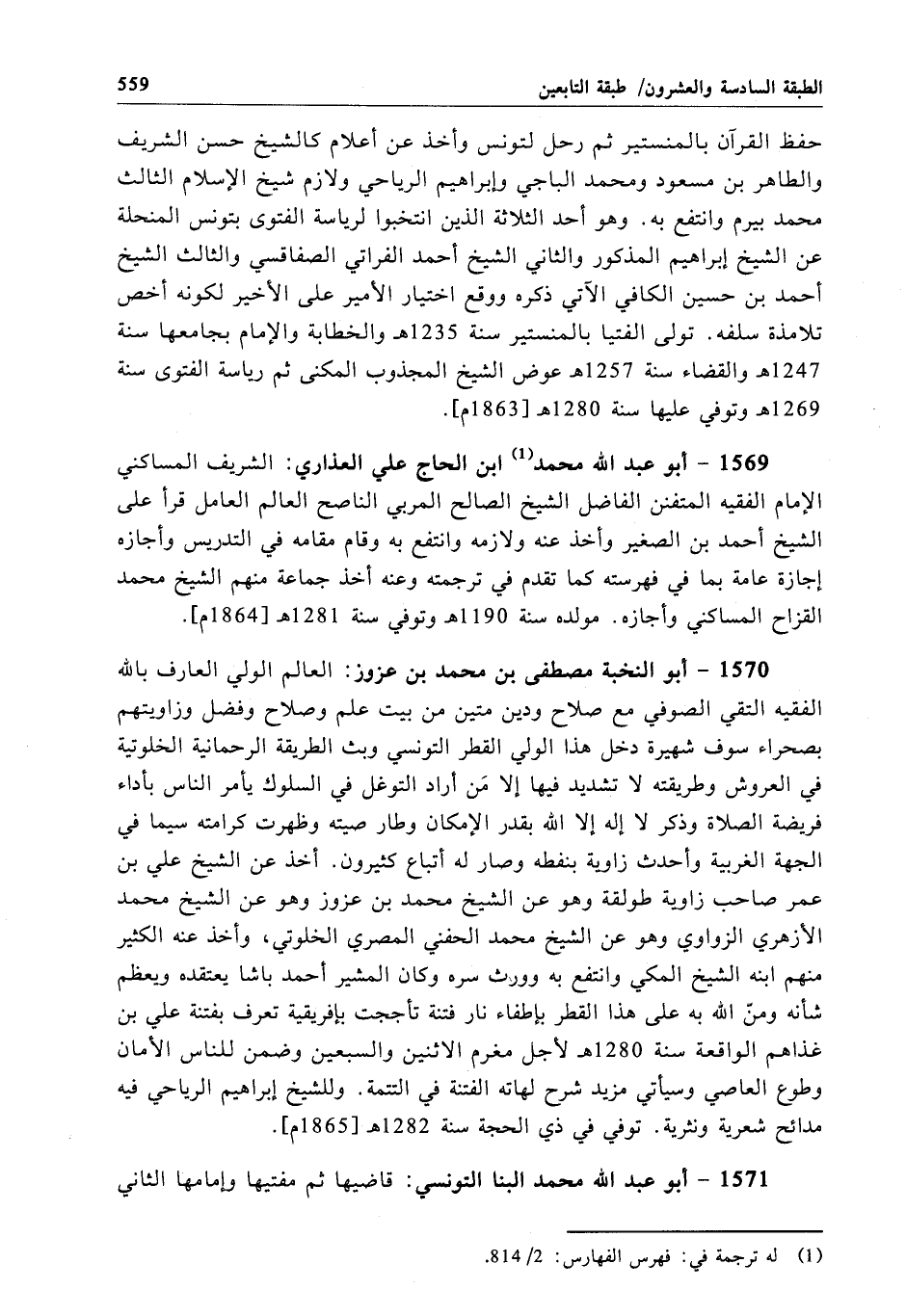 1569 - أبو عبد الله محمَّد ابن الحاج علي العذاري: الشريف المساكني الإِمام الفقيه المتفنن الفاضل الشيخ الصالح المربي الناصح العالم العامل قرأ على الشيخ أحمد بن الصغير وأخذ عنه ولازمه وانتفع به وقام مقامه في التدريس وأجازه إجازة عامة بما في فهرسته كما تقدم في ترجمته وعنه أخذ جماعة منهم الشيخ محمَّد القزاح المساكني وأجازه. مولده سنة 1190 هـ وتوفي سنة 1281 هـ[1864 م].