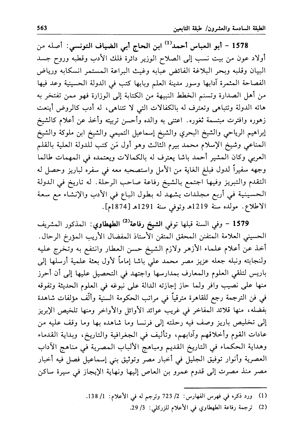 1579 - وفي السنة قبلها توفي الشيخ رفاعة الطهطاوي: المذكور المشريف الحسيني العلامة المتفنن المحقق المتقين الأستاذ المفضال الأريب المؤرخ الرحال. أخذ عن أعلام علماء الأزهر ولازم الشيخ حسن العطار وانتفع به وتخرج عليه ولنجابته ونبله جعله عزيز مصر محمَّد علي باشا إماماً لأول بعثة علمية أرسلها إلى باريس لتلقي العلوم والمعارف بمدارسها واجتهد في التحصيل عليها إلى أن أحرز منها على نصيب وافر ولما حاز إجازته الدالة على نبوغه في العلوم الحديثة وتفوقه في فن الترجمة رجع للقاهرة مترقياً في مراتب الحكومة السنية وألّف مؤلفات شاهدة بفضله، منها قلائد المفاخر في غريب عوائد الأوائل والأواخر ومنها تلخيص الإبريز إلى تخليص باريز وصف فيه رحلته إلى فرنسا وما شاهده بها وما وقف عليه من عادات القوم وأخلاقهم وآدابهم، وتأليف في الجغرافية والتاريخ، وبداية القدماء وهداية الحكماء في التاريخ القديم ومباهج الألباب المصرية في مناهج الآداب العصرية وأنوار توفيق الجليل في أخبار مصر وتوثيق بني إسماعيل فصل فيه أخبار مصر منذ مصرت إلى قدوم عمرو بن العاص إليها ونهاية الإيجاز في سيرة ساكن