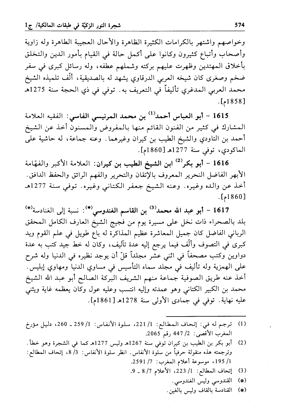 1617 - أبو عبد الله محمَّد بن القاسم الغندوسي: نسبة إلى الغنادسة بلد بالصحراء ذات نخل على مسيرة يوم من فجيج الشيخ العارف الكامل المحقق الرباني الفاضل كان جميل المعاشرة عظيم المذاكرة له باع طويل في علم القوم ويد كبرى في التصوف وألّف فيما يرجع إليه عدة تآليف، وكان له خط جيد كتب به عدة دواوين وكتب مصحفاً في اثني عشر مجلداً قلّ أن يوجد نظيره في الدنيا وله شرح على الهمزية وله تأليف في مجلد سماه التأسيس في مساوي الدنيا ومهاوي إبليس. أخذ عنه طريق الصوفية جماعة منهم الشريف البركة الصالح أبو عبد الله الشيخ محمَّد بن الكبير الكتاني وهو عمدته وإليه انتسب وعليه عول وكان يعظمه غاية ويثني عليه نهاية. توفي في جمادى الأولى سنة 1278 هـ[1861 م].