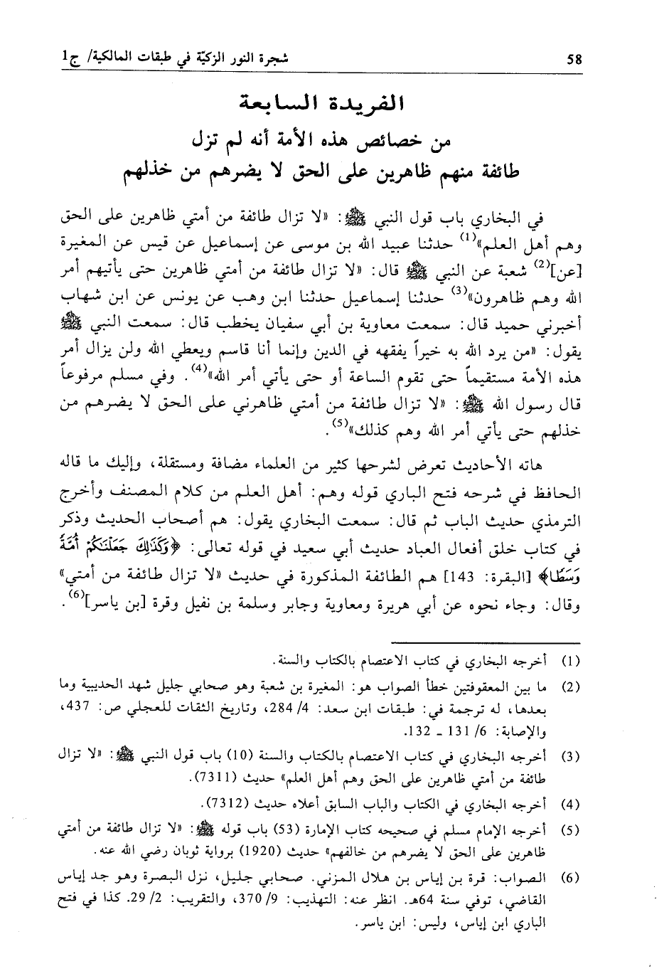 في البخاري باب قول النبي - صلى الله عليه وسلم -: "لا تزال طائفة من أمتي ظاهرين على الحق وهم أهل العلم" حدثنا عبيد الله بن موسى عن إسماعيل عن قيس عن المغيرة [عن] شعبة عن النبي - صلى الله عليه وسلم - قال: "لا تزال طائفة من أمتي ظاهرين حتى يأتيهم أمر الله وهم ظاهرون" حدثنا إسماعيل حدثنا ابن وهب عن يونس عن ابن شهاب أخبرني حميد قال: سمعت معاوية بن أبي سفيان يخطب قال: سمعت النبي - صلى الله عليه وسلم - يقول: "من يرد الله به خيراً يفقهه في الدين وإنما أنا قاسم ويعطي الله ولن يزال أمر هذه الأمة مستقيماً حتى تقوم الساعة أو حتى يأتي أمر الله". وفي مسلم مرفوعاً قال رسول الله - صلى الله عليه وسلم -: "لا تزال طائفة من أمتي ظاهرني على الحق لا يضرهم من خذلهم حتى يأتي أمر الله وهم كذلك".