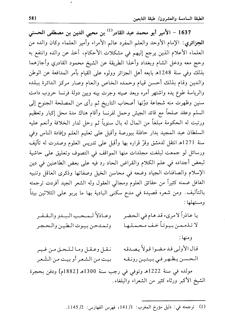1637 - الأمير أبو محمَّد عبد القادر بن محيي الدين بن مصطفى الحسني الجزائري: الإِمام الأوحد والعلم المفرد عالم الأمراء وأمير العلماء وكان والده من العلماء الأعلام الذين يرجع إليهم في مشكلات الأحكام، أخذ عن والده وانتفع به وحج معه ودخل الشام وبغداد وأخذا الطريقة عن الشيخ محمود القادري وأجازهما بذلك وفي سنة 1248 هـ بايعه أهل الجزائر وولوه على القيام بأمر المدافعة عن الوطن والدين وقام بذلك أحسن قيام وحمده الخاص والعام وصار مركز الدائرة ببلده والرياسة طوع يده واشتهر أمره وبعد صيته وجرت بينه وبين دولة فرنسا حروب دامت سنين وظهرت منه شجاعة دوّنها أصحاب التاريخ ثم رأى من المصلحة الجنوح إلى السلم وعقد صلحاً مع قائد الجيش وحمل لفرنسا وأقام هناك مدة محل إكبار وتعظيم ورتبت له الحكومة مبلغاً من المال له بال سنوياً ثم رحل لدار الخلافة وأنعم عليه السلطان عبد المجيد بدار حافلة ببورصة وأقبل على تعليم العلم وإفادة الناس وفي سنة 1271هـ انتقل لدمشق وقرّ قراره بها وأقبل على تدريس العلوم وصدرت له تآليف ورسائل لو جمعت لبلغت مجلدات منها المواقف في التصوف وتعليق على حاشية لبعض أجداده في علم الكلام والقراض الحاد رد فيه على بعض الطاعنين في دين الإِسلام والصافنات الجياد وضعه في محاسن الخيل وصفاتها وذكرى العاقل وتنبيه الغافل ضمنه كثيراً من حقائق العلوم ومجالي العقول وله الشعر الجيد أفردت ترجمته بالتأليف. ومن شعره قصيدة في مدح سكنى البادية بها ما يربو على الثلاثين بيتاً ومستهلها: