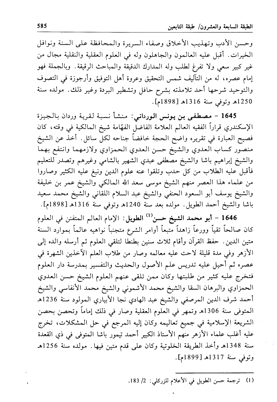 1646 - أبو محمَّد الشيخ حسن الطويل: الإِمام العالم المتفنن في العلوم كان صالحاً تقياً وورعاً زاهداً متبعاً أوامر الشرع متجنباً نواهيه عالماً بموارد السنة متين الدين. حفظ القرآن وأقام ثلاث سنين بطنطا لتلقي العلوم ثم أرسله والده إلى الأزهر وفي مدة قليلة لاحت عليه معالمه وصار من طلاب العلم الآخذين الشهرة في عصره ثم أحيل عليه تدريس علم الأصول والحديث والتفسير بمدرسة دار العلوم فتخرج عليه كثير من طلبتها وكان ممن تلقى عنهم العلوم الشيخ حسن العدوي الحمزاوي والبرهان السقا والشيخ محمَّد الأشموني والشيخ محمَّد الأنفاسي والشيخ أحمد شرف الدين المرصفي والشيخ عبد الهادي نجا الأبياري المولود سنة 1236هـ المتوفى سنة 1306 هـ وتمهر في العلوم العقلية وصار في ذلك إماماً وتحصن بحصن الشريعة الإِسلامية في جميع تعاليمه وكان إليه المرجع في حل المشكلات، تخرج عليه أغلب علماء الأزهر منهم الأستاذ الكبير أحمد تيمور باشا المتوفى في ذي القعدة سنة 1348هـ وأخذ الطريقة الخلوتية وكان على قدم متين فيها. مولده سنة 1256هـ وتوفي سنة 1317هـ[1899م].