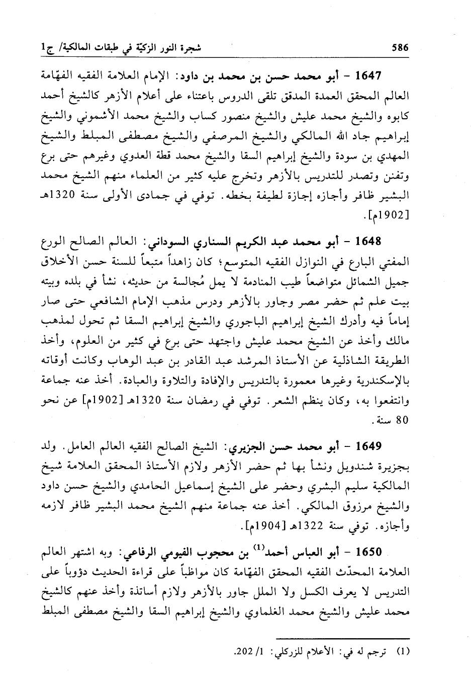 1647 - أبو محمَّد حسن بن محمَّد بن داود: الإِمام العلامة الفقيه الفهّامة العالم المحقق العمدة المدقق تلقى الدروس باعتناء على أعلام الأزهر كالشيخ أحمد كابوه والشيخ محمَّد عليش والشيخ منصور كساب والشيخ محمَّد الأشموني والشيخ إبراهيم جاد الله المالكي والشيخ المرصفي والشيخ مصطفى المبلط والشيخ المهدي بن سودة والشيخ إبراهيم السقا والشيخ محمَّد قطة العدوي وغيرهم حتى برع وتفنن وتصدر للتدريس بالأزهر وتخرج عليه كثير من العلماء منهم الشيخ محمَّد البشير ظافر وأجازه إجازة لطيفة بخطه. توفي في جمادى الأولى سنة 1320هـ[1902م].