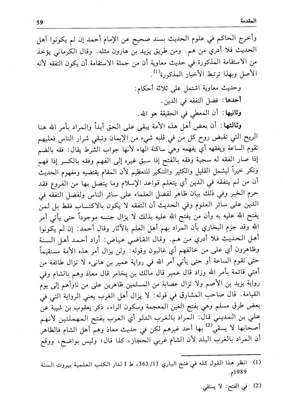 وثالثها: أن بعض أهل هذه الأمة يبقى على الحق أبداً والمراد بأمر الله هنا الريح التي تقبض روح كل من في قلبه شيء من الإيمان وتبقي شرار الناس فعليهم تقوم الساعة ويفقهه أي يفهمه وهي ساكنة الهاء لأنها جواب الشرط يقال: فقه بالضم إذا صار الفقه له سجية وفقه بالفتح إذا سبق غيره إلى الفهم وفقه بالكسر إذا فهم ونكر خيراً ليشمل القليل والكثير والتنكير للتعظيم لأن المقام يقتضيه ومفهوم الحديث أن من لم يتفقه في الدين أي يتعلم قواعد الإِسلام وما يتصل بها من الفروع فقد حرم الخير وفي ذلك بيان ظاهر لفضل العلماء على سائر الناس ولفضل التفقه في الدين على سائر العلوم وفي الحديث أن التفقه لا يكون بالاكتساب فقط بل لمن يفتح الله عليه به وأن من يفتح الله عليه بذلك لا يزال جنسه موجوداً حتى يأتي أمر الله وقد جزم البخاري بأن المراد بهم أهل العلم بالآثار وقال أحمد: إن لم يكونوا أهل الحديث فلا أدري من هم. وقال القاضي عياض: أراد أحمد أهل السنة وظاهرون أي على من خالفهم أي غالبون وقوله: ولن يزال أمر هذه الأمة مستقيماً حتى تقوم الساعة أو حتى يأتي أمر الله في رواية عمير بن هانئ لا تزال طائفة من أمتي قائمة بأمر الله وزاد قال عمير قال مالك بن يخامر قال معاذ وهم بالشام وفي رواية يزيد بن الأصم ولا تزال عصابة من المسلمين ظاهرين على من ناوأهم إلى يوم القيامة. قال صاحب المشارق في قوله: لا يزال أهل الغرب يعني الرواية التي في بعض طرق مسلم وهي بفتح الغين المعجمة وسكون الراء، ذكر يعقوب بن شيبة عن علي بن المديني قال: المراد بالغرب الدلو أي العرب بفتح المهملتين لأنهم أصحابها لا يسقي بها أحد غيرهم لكن في حديث معاذ وهم أهل الشام فالظاهر أن المراد بالغرب البلد لأن الشام غربي الحجاز، كذا قال؛ وليس بواضح، ووقع