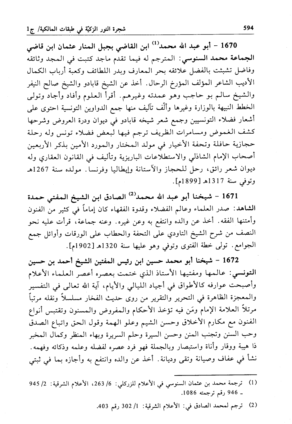 1670 - أبو عبد الله محمَّد ابن القاضي بجبل المنار عثمان ابن قاضي الجماعة محمَّد السنوسي: المترجم له فيما تقدم ماجد كتبت في المجد وثائقه وفاضل تشبثت بالفضل علائقه بحر المعارف وبدر اللطائف وكعبة أرباب الكمال الأديب الشاعر المؤلف المؤرخ الرحال. أخذ عن الشيخ قابادو والشيخ صالح النيفر والشيخ سالم بو حاجب وهو عمدته وغيرهم. أقرأ العلوم وأفاد وأجاد وتولى الخطط النبيهة بالوزارة وغيرها وألّف تآليف منها جمع الدواوين التونسية احتوى على أشعار فضلاء التونسيين وجمع شعر شيخه قابادو في ديوان ودرة العروض وشرحها كشف الغموض ومسامرات الظريف ترجم فيها لبعض فضلاء تونس وله رحلة حجازية حافلة وتحفة الأخيار في مولد المختار والمورد الأمين بذكر الأربعين أصحاب الإِمام الشاذلي والاستطلاعات الباريزية وتأليف في القانون العقاري وله ديوان شعر رائق، رحل للحجاز والآستانة وإيطاليا وفرنسا. مولده سنة 1267هـ وتوفي سنة 1317هـ[1899م].