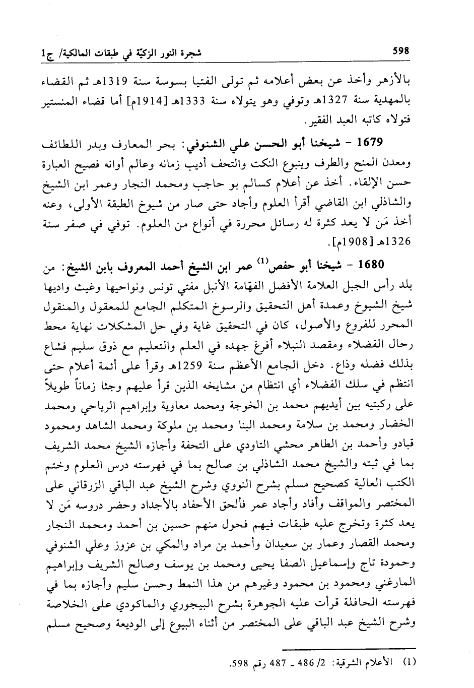 1680 - شيخنا أبو حفص عمر ابن الشيخ أحمد المعروف بابن الشيخ: من بلد رأس الجبل العلامة الأفضل الفهّامة الأنبل مفتي تونس ونواحيها وغيث واديها شيخ الشيوخ وعمدة أهل التحقيق والرسوخ المتكلم الجامع للمعقول والمنقول المحرر للفروع والأصول، كان في التحقيق غاية وفي حل المشكلات نهاية محط رحال الفضلاء ومقصد النبلاء أفرغ جهده في العلم والتعليم مع ذوق سديم فشاع بذلك فضله وذاع. دخل الجامع الأعظم سنة 1259هـ وقرأ على أئمة أعلام حتى انتظم في سلك الفضلاء أي انتظام من مشايخه الذين قرأ عليهم وجثا زماناً طويلاً على ركبتيه بين أيديهم محمَّد بن الخوجة ومحمد معاوية وإبراهيم الرياحي ومحمد الخضار ومحمد بن سلامة ومحمد البنا ومحمد بن ملوكة ومحمد الشاهد ومحمود قبادو وأحمد بن الطاهر محشي التاودي على التحفة وأجازه الشيخ محمَّد الشريف بما في ثبته والشيخ محمَّد الشاذلي بن صالح بما في فهرسته درس العلوم وختم الكتب العالية كصحيح مسلم بشرح النووي وشرح الشيخ عبد الباقي الزرقاني على المختصر والمواقف وأفاد وأجاد عمر فألحق الأحفاد بالأجداد وحضر دروسه مَن لا يعد كثرة وتخرج عليه طبقات فيهم فحول منهم حسين بن أحمد ومحمد النجار ومحمد القصار وعمار بن سعيدان وأحمد بن مراد والمكي بن عزوز وعلي الشنوفي وحمودة تاج وإسماعيل الصفا يحيى ومحمد بن يوسف وصالح الشريف وإبراهيم المارغني ومحمود بن محمود وغيرهم من هذا النمط وحسن سليم وأجازه بما في فهرسته الحافلة قرأت عليه الجوهرة بشرح البيجوري والماكودي على الخلاصة وشرح الشيخ عبد الباقي على المختصر من أثناء البيوع إلى الوديعة وصحيح مسلم