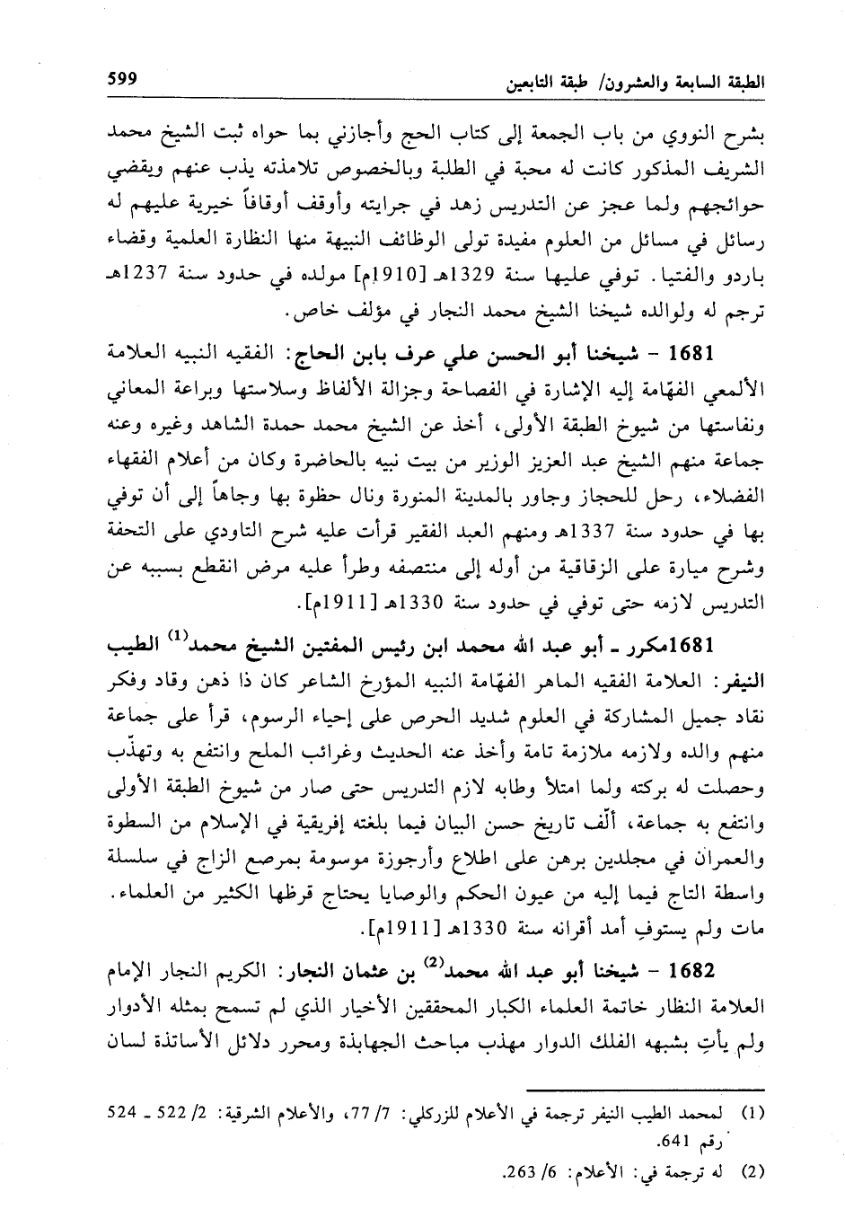 1682 - شيخنا أبو عبد الله محمَّد بن عثمان النجار: الكريم النجار الإِمام العلامة النظار خاتمة العلماء الكبار المحققين الأخيار الذي لم تسمح بمثله الأدوار ولم يأتِ بشبهه الفلك الدوار مهذب مباحث الجهابذة ومحرر دلائل الأساتذة لسان