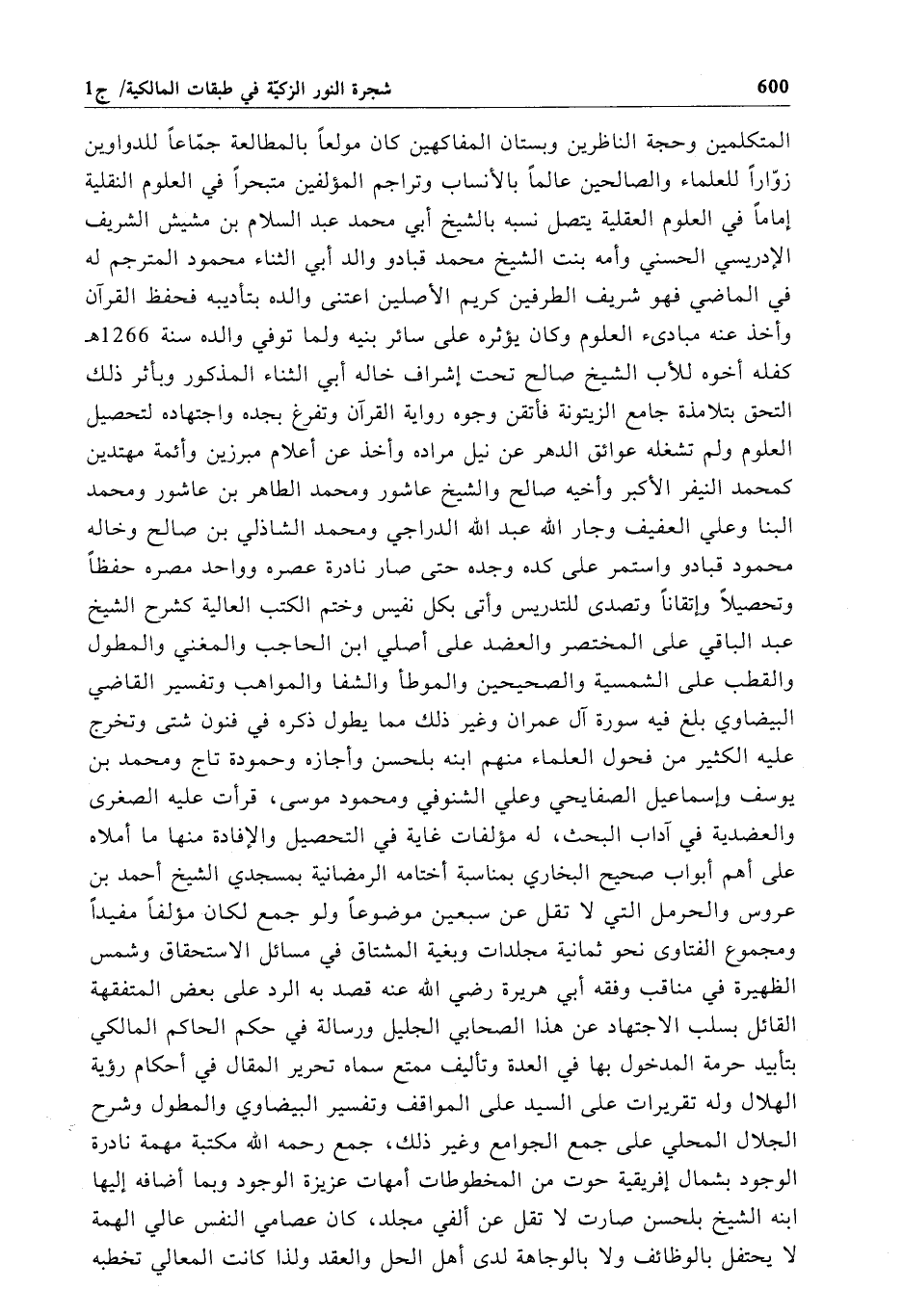 المتكلمين وحجة الناظرين وبستان المفاكهين كان مولعاً بالمطالعة جمّاعاً للدواوين زوّاراً للعلماء والصالحين عالماً بالإنساب وتراجم المؤلفين متبحراً في العلوم النقلية إماماً في العلوم العقلية يتصل نسبه بالشيخ أبي محمَّد عبد السلام بن مشيش الشريف الإدريسي الحسني وأمه بنت الشيخ محمَّد قبادو والد أبي الثناء محمود المترجم له في الماضي فهو شريف الطرفين كريم الأصلين اعتنى والده بتأديبه فحفظ القرآن وأخذ عنه مبادئ العلوم وكان يؤثره على سائر بنيه ولما توفي والده سنة 1266 هـ كفله أخوه للأب الشيخ صالح تحت إشراف خاله أبي الثناء المذكور وبأثر ذلك التحق بتلامذة جامع الزيتونة فأتقن وجوه رواية القرآن وتفرغ بجده واجتهاده لتحصيل العلوم ولم تشغله عوائق الدهر عن نيل مراده وأخذ عن أعلام مبرزين وأئمة مهتدين كمحمد النيفر الأكبر وأخيه صالح والشيخ عاشور ومحمد الطاهر بن عاشور ومحمد البنا وعلي العفيف وجار الله عبد الله الدراجي ومحمد الشاذلي بن صالح وخاله محمود قبادو واستمر على كده وجده حتى صار نادرة عصره وواحد مصره حفظاً وتحصيلاً وإتقاناً وتصدى للتدريس وأتى بكل نفيس وختم الكتب العالية كشرح الشيخ عبد الباقي على المختصر والعضد على أصلي ابن الحاجب والمغني والمطول والقطب على الشمسية والصحيحين والموطأ والشفا والمواهب وتفسير القاضي البيضاوي بلغ فيه سورة آل عمران وغير ذلك مما يطول ذكره في فنون شتى وتخرج عليه الكثير من فحول العلماء منهم ابنه بلحسن وأجازه وحمودة تاج ومحمد بن يوسف وإسماعيل الصفايحي وعلي الشنوفي ومحمود موسى، قرأت عليه الصغرى والعضدية في آداب البحث، له مؤلفات غاية في التحصيل والإفادة منها ما أملاه على أهم أبواب صحيح البخاري بمناسبة أختامه الرمضانية بمسجدي الشيخ أحمد بن عروس والحرمل التي لا تقل عن سبعين موضوعاً ولو جمع لكان مؤلفاً مفيداً ومجموع الفتاوى نحو ثمانية مجلدات وبغية المشتاق في مسائل الاستحقاق وشمس الظهيرة في مناقب وفقه أبي هريرة رضي الله عنه قصد به الرد على بعض المتفقهة القائل بسلب الاجتهاد عن هذا الصحابي الجليل ورسالة في حكم الحاكم المالكي بتأبيد حرمة المدخول بها في العدة وتأليف ممتع سماه تحرير المق الذي أحكام رؤية الهلال وله تقريرات على السيد على المواقف وتفسير البيضاوي والمطول وشرح الجلال المحلي على جمع الجوامع وغير ذلك، جمع رحمه الله مكتبة مهمة نادرة الوجود بشمال إفريقية حوت من المخطوطات أمهات عزيزة الوجود وبما أضافه إليها ابنه الشيخ بلحسن صارت لا تقل عن ألفي مجلد، كان عصامي النفس عالي الهمة لا يحتفل بالوظائف ولا بالوجاهة لدى أهل الحل والعقد ولذا كانت المعالي تخطبه