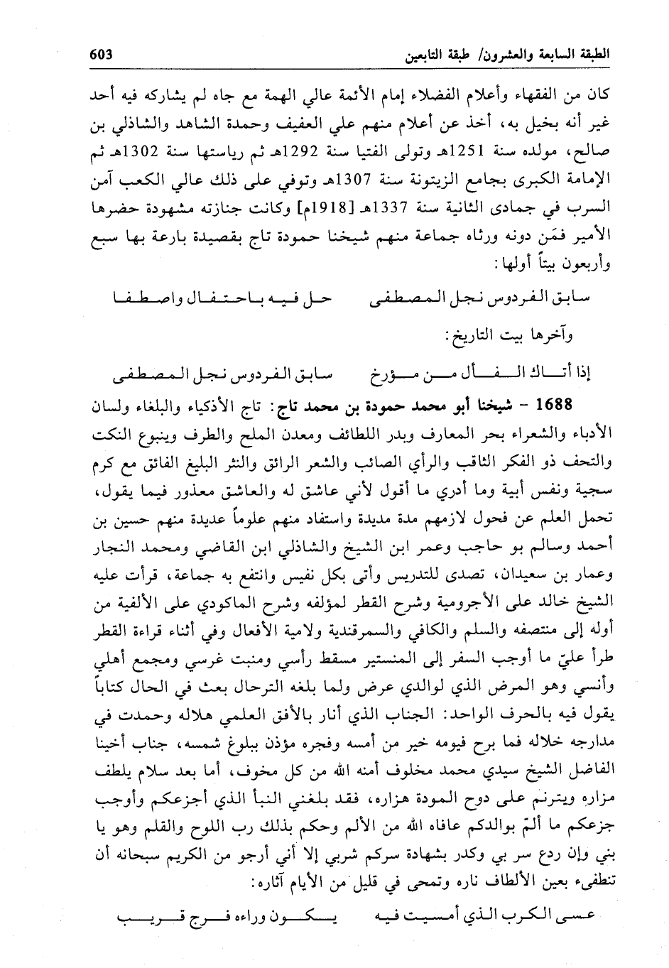 1688 - شيخنا أبو محمَّد حمودة بن محمَّد تاج: تاج الأذكياء والبلغاء ولسان الأدباء والشعراء بحر المعارف وبدر اللطائف ومعدن الملح والطرف وينبوع النكت والتحف ذو الفكر الثاقب والرأي الصائب والشعر الرائق والنثر البليغ الفائق مع كرم سجية ونفس أبية وما أدري ما أقول لأني عاشق له والعاشق معذور فيما يقول، تحمل العلم عن فحول لازمهم مدة مديدة واستفاد منهم علوماً عديدة منهم حسين بن أحمد وسالم بو حاجب وعمر ابن الشيخ والشاذلي ابن القاضي ومحمد النجار وعمار بن سعيدان، تصدى للتدريس وأتى بكل نفيس وانتفع به جماعة، قرأت عليه الشيخ خالد على الأجرومية وشرح القطر لمؤلفه وشرح الماكودي على الألفية من أوله إلى منتصفه والسلم والكافي والسمرقندية ولامية الأفعال وفي أثناء قراءة القطر طرأ علىّ ما أوجب السفر إلى المنستير مسقط رأسي ومنبت غرسي ومجمع أهلي وأنسي وهو المرض الذي لوالدي عرض ولما بلغه الترحال بعث في الحال كتاباً يقول فيه بالحرف الواحد: الجناب الذي أنار بالأفق العلمي هلاله وحمدت في مدارجه خلاله فما برح فيومه خير من أمسه وفجره مؤذن ببلوغ شمسه، جناب أخينا الفاضل الشيخ سيدي محمَّد مخلوف أمنه الله من كل مخوف، أما بعد سلام يلطف مزاره ويترنم على دوح المودة هزاره، فقد بلغني النبأ الذي أجزعكم وأوجب جزعكم ما ألمّ بوالدكم عافاه الله من الألم وحكم بذلك رب اللوح والقلم وهو يا بني وإن ردع سر بي وكدر بشهادة سركم شربي إلا أني أرجو من الكريم سبحانه أن تنطفىء بعين الألطاف ناره وتمحى في قليل من الأيام آثاره:
