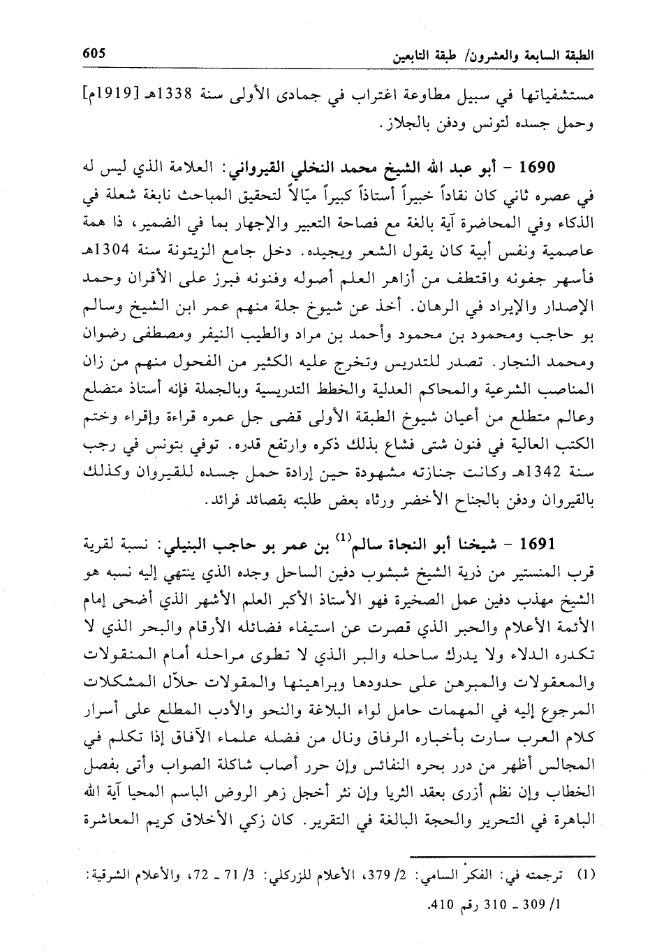 1691 - شيخنا أبو النجاة سالم بن عمر بو حاجب البنيلي: نسبة لقرية قرب المنستير من ذرية الشيخ شبشوب دفين الساحل وجده الذي ينتهي إليه نسبه هو الشيخ مهذب دفين عمل الصخيرة فهو الأستاذ الأكبر العلم الأشهر الذي أضحى إمام الأئمة الأعلام والحبر الذي قصرت عن استيفاء فضائله الأرقام والبحر الذي لا تكدره الدلاء ولا يدرك ساحله والبر الذي لا تطوى مراحله أمام المنقولات والمعقولات والمبرهن على حدودها وبراهينها والمقولات حلاّل المشكلات المرجوع إليه في المهمات حامل لواء البلاغة والنحو والأدب المطلع على أسرار كلام العرب سارت بأخباره الرفاق ونال من فضله علماء الآفاق إذا تكلم في المجالس أظهر من درر بحره النفائس وإن حرر أصاب شاكلة الصواب وأتى بفصل الخطاب وإن نظم أزرى بعقد الثريا وإن نثر أخجل زهر الروض الباسم المحيا آية الله الباهرة في التحرير والحجة البالغة في التقرير. كان زكي الأخلاق كريم المعاشرة
