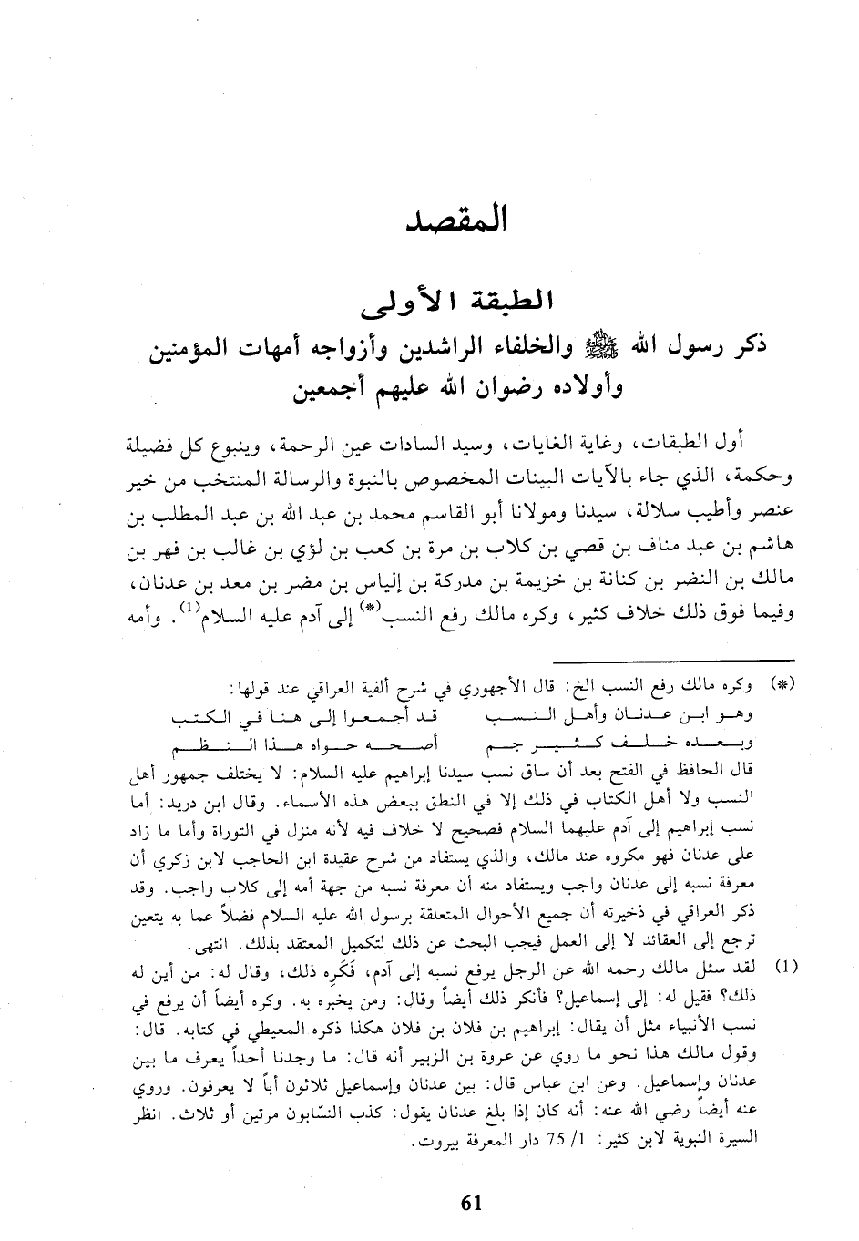 أول الطبقات، وغاية الغايات، وسيد السادات عين الرحمة، وينبوع كل فضيلة وحكمة، الذي جاء بالآيات البينات المخصوص بالنبوة والرسالة المنتخب من خير عنصر وأطيب سلالة، سيدنا ومولانا أبو القاسم محمَّد بن عبد الله بن عبد المطلب بن هاشم بن عبد مناف بن قصي بن كلاب بن مرة بن كعب بن لؤي بن غالب بن فهو بن مالك بن النضر بن كنانة بن خزيمة بن مدركة بن إلياس بن مضر بن معد بن عدنان، وفيما فوق ذلك خلاف كثير، وكره مالك رفع النسب إلى آدم عليه السلام. وأمه