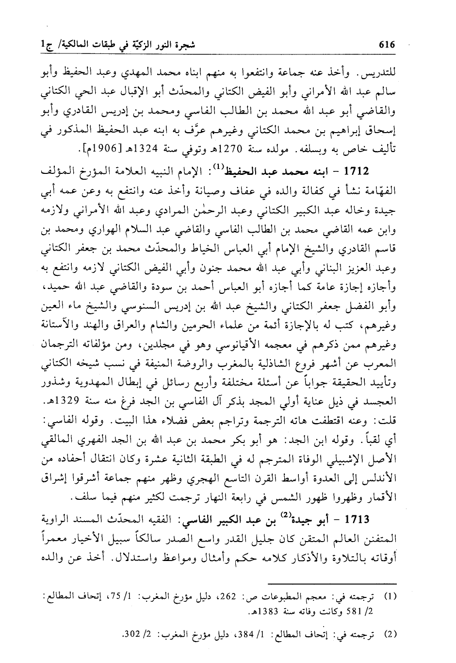 1712 - ابنه محمَّد عبد الحفيظ: الإِمام النبيه العلامة المؤرخ المؤلف الفهّامة نشأ في كفالة والده في عفاف وصيانة وأخذ عنه وانتفع به وعن عمه أبي جيدة وخاله عبد الكبير الكتاني وعبد الرحمن المرادي وعبد الله الأمراني ولازمه وابن عمه القاضي محمَّد بن الطالب الفاسي والقاضي عبد السلام الهواري ومحمد بن قاسم القادري والشيخ الإِمام أبي العباس الخياط والمحدّث محمَّد بن جعفر الكتاني وعبد العزيز البناني وأبي عبد الله محمَّد جنون وأبي الفيض الكتاني لازمه وانتفع به وأجازه إجازة عامة كما أجازه أبو العباس أحمد بن سودة والقاضي عبد الله حميد، وأبو الفضل جعفر الكتاني والشيخ عبد الله بن إدريس السنوسي والشيخ ماء العين وغيرهم، كتب له بالإجازة أئمة من علماء الحرمين والشام والعراق والهند والآستانة وغيرهم ممن ذكرهم في معجمه الأقيانوسي وهو في مجلدين، ومن مؤلفاته الترجمان المعرب عن أشهر فروع الشاذلية بالمغرب والروضة المنيفة في نسب شيخه الكتاني وتأييد الحقيقة جواباً عن أسئلة مختلفة وأربع رسائل في إبطال المهدوية وشذور العجسد في ذيل عناية أولي المجد بذكر آل الفاسي بن الجد فرغ منه سنة 1329 هـ. قلت: وعنه اقتطفت هاته الترجمة وتراجم بعض فضلاء هذا البيت. وقوله الفاسي: أي لقباً. وقوله ابن الجد: هو أبو بكر محمَّد بن عبد الله بن الجد الفهري المالقي الأصل الإشبيلي الوفاة المترجم له في الطبقة الثانية عشرة وكان انتقال أحفاده من الأندلس إلى العدوة أواسط القرن التاسع الهجري وظهر منهم جماعة أشرقوا إشراق الأقمار وظهروا ظهور الشمس في رابعة النهار ترجمت لكثير منهم فيما سلف.