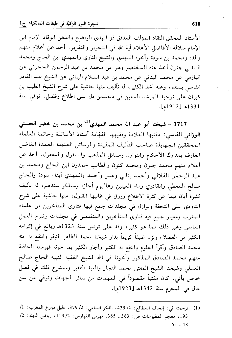1717 - شيخنا أبو عبد الله محمَّد المهدي بن محمَّد بن خضر الحسني الوزاني الفاسي: مفتيها العلامة وفقيهها الفهّامة أستاذ الأساتذة وخاتمة العلماء المحققين الجهابذة صاحب التآليف المفيدة والرسائل العديدة العمدة الفاضل العارف بمدارك الأحكام والنوازل ومسائل المذهب والمنقول والمعقول. أخذ عن أعلام منهم محمَّد جنون ومحمد كنون والطالب حمدون ابن الحاج ومحمد بن عبد الرحمن الفلالي وأحمد بناني وعمر وأحمد والمهدي أبناء سودة والحاج صالح المعطي والقادري وماء العينين وغالبهم أجازه وسنذكر سندهم، له تآليف كثيرة أبان فيها عن كثرة الاطلاع ورزق في غالبها القبول، منها حاشية على شرح التاودي على التحفة ونوازل في مجلدات جمع فيها فتاوى المتأخرين من علماء المغرب ومعيار جمع فيه فتاوى المتأخرين والمتقدمين في مجلدات وشرح العمل الفاسي وغير ذلك مما هو كثير، وفد على تونس سنة 1323 هـ وبالغ في إكرامه الكثير من الفضلاء ونزل ضيفاً كريماً بدار شيخنا محمَّد الطاهر النيفر وانتفع به ابنه محمَّد الصادق وأقرأ العلوم وانتفع به الكثير وأجاز الكثير بما حوته فهرسته الحافلة منهم محمَّد الصادق المذكور وأخونا في الله الشيخ الفقيه النبيه الحاج صالح العسلي وشيخنا الشيخ المفتي محمَّد النجار والعبد الفقير وسنشرح ذلك في فصل خاص يأتي، كان مفتياً مقصوداً في المهمات من سائر الجهات وتوفي عن سن عال في المحرم سنة 1342 هـ[1923 م].