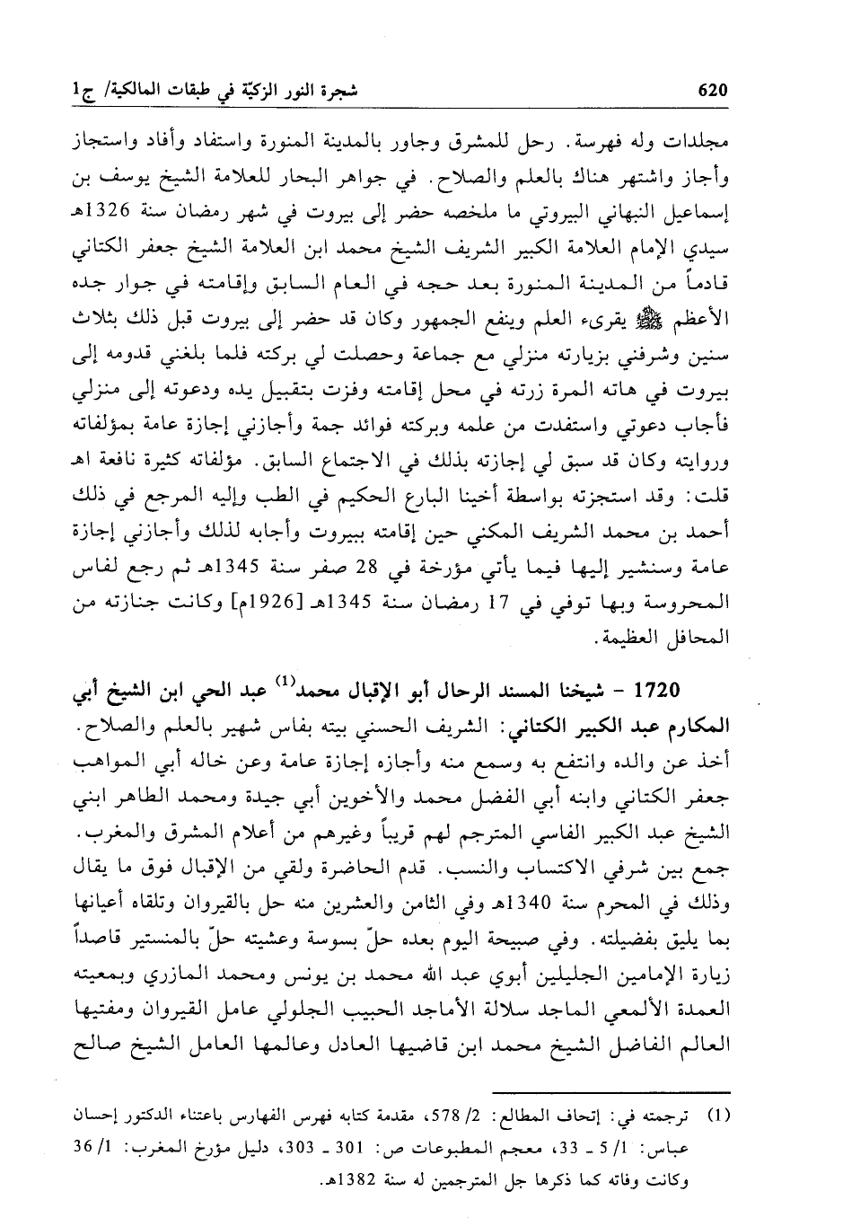 1720 - شيخنا المسند الرحال أبو الإقبال محمَّد عبد الحي ابن الشيخ أبي المكارم عبد الكبير الكتاني: الشريف الحسني بيته بفاس شهير بالعلم والصلاح. أخذ عن والده وانتفع به وسمع منه وأجازه إجازة عامة وعن خاله أبي المواهب جعفر الكتاني وابنه أبي الفضل محمَّد والأخوين أبي جيدة ومحمد الطاهر ابني الشيخ عبد الكبير الفاسي المترجم لهم قريباً وغيرهم من أعلام المشرق والمغرب. جمع بين شرفي الاكتساب والنسب. قدم الحاضرة ولقي من الإقبال فوق ما يقال وذلك في المحرم سنة 1340 هـ وفي الثامن والعشرين منه حل بالقيروان وتلقاه أعيانها بما يليق بفضيلته. وفي صبيحة اليوم بعده حلّ بسوسة وعشيته حلّ بالمنستير قاصداً زيارة الإمامين الجليلين أبوي عبد الله محمَّد بن يونس ومحمد المازري وبمعيته العمدة الألمعي الماجد سلالة الأماجد الحبيب الجلولي عامل القيروان ومفتيها العالم الفاضل الشيخ محمَّد ابن قاضيها العادل وعالمها العامل الشيخ صالح