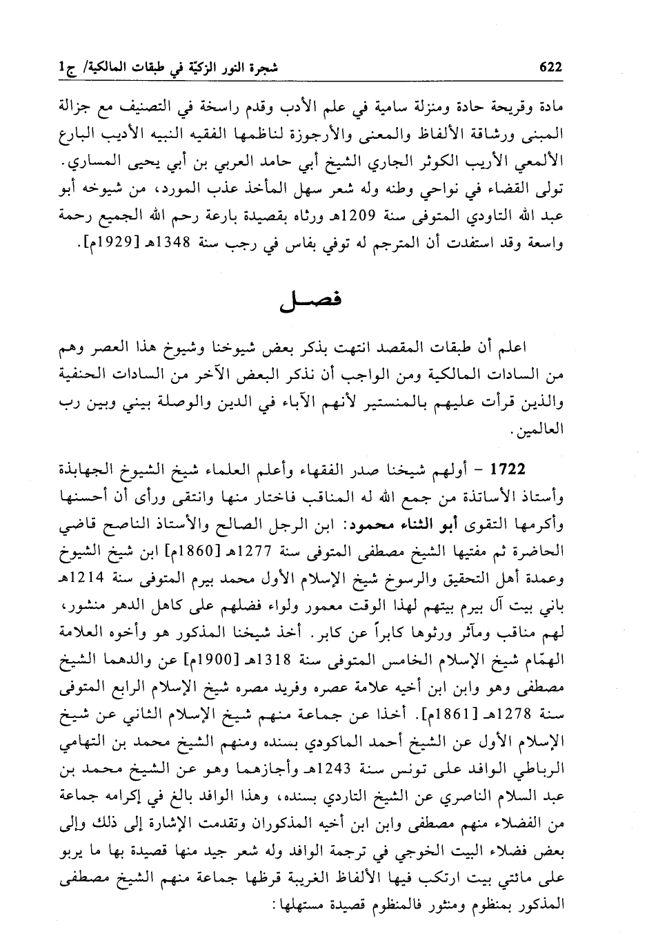 1722 - أولهم شيخنا صدر الفقهاء وأعلم العلماء شيخ الشيوخ الجهابذة وأستاذ الأساتذة من جمع الله له المناقب فاختار منها وانتقى ورأى أن أحسنها وأكرمها التقوى أبو الثناء محمود: ابن الرجل الصالح والأستاذ الناصح قاضي الحاضرة ثم مفتيها الشيخ مصطفى المتوفى سنة 1277 هـ[1860م]، ابن شيخ الشيوخ وعمدة أهل التحقيق والرسوخ شيخ الإِسلام الأول محمَّد بيرم المتوفى سنة 1214 هـ باني بيت آل بيرم بيتهم لهذا الوقت معمور ولواء فضلهم على كأهل الدهر منشور، لهم مناقب ومآثر ورثوها كابراً عن كابر. أخذ شيخنا المذكور هو وأخوه العلامة الهمّام شيخ الإِسلام الخامس المتوفى سنة 1318 هـ[1900م]، عن والدهما الشيخ مصطفى وهو وابن ابن أخيه علامة عصره وفريد مصره شيخ الإِسلام الرابع المتوفى سنة 1278 هـ[1861م]. أخذا عن جماعة منهم شيخ الإِسلام الثاني عن شيخ الإِسلام الأول عن الشيخ أحمد الماكودي بسنده ومنهم الشيخ محمَّد بن التهامي الرباطي الوافد على تونس سنة 1243 هـ وأجازهما وهو عن الشيخ محمَّد بن عبد السلام الناصري عن الشيخ التاردي بسنده، وهذا الوافد بالغ في إكرامه جماعة من الفضلاء منهم مصطفى وابن ابن أخيه المذكوران وتقدمت الإشارة إلى ذلك وإلى بعض فضلاء البيت الخوجي في ترجمة الوافد وله شعر جيد منها قصيدة بها ما يربو على مائتي بيت ارتكب فيها الألفاظ الغريبة قرظها جماعة منهم الشيخ مصطفى المذكور بمنظوم ومنثور فالمنظوم قصيدة مستهلها:
