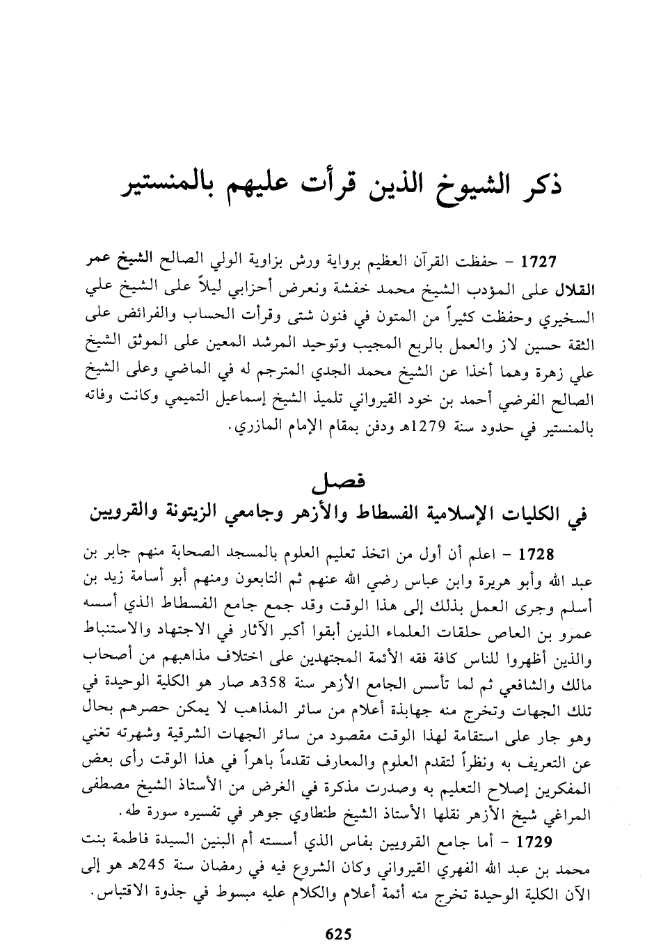 1728 - اعلم أن أول من اتخذ تعليم العلوم بالمسجد الصحابة منهم جابر بن عبد الله وأبو هريرة وابن عباس رضي الله عنهم ثم التابعون ومنهم أبو أسامة زيد بن أسلم وجرى العمل بذلك إلى هذا الوقت وقد جمع جامع الفسطاط الذي أسسه عمرو بن العاص حلقات العلماء الذين أبقوا أكبر الآثار في الاجتهاد والاستنباط والذين أظهروا للناس كافة فقه الأئمة المجتهدين على اختلاف مذاهبهم من أصحاب مالك والشافعي ثم لما تأسس الجامع الأزهر سنة 358 هـ صار هو الكلية الوحيدة في تلك الجهات وتخرج منه جهابذة أعلام من سائر المذاهب لا يمكن حصرهم بحال وهو جار على استقامة لهذا الوقت مقصود من سائر الجهات الشرقية وشهرته تغني عن التعريف به ونظراً لتقدم العلوم والمعارف تقدماً باهراً في هذا الوقت رأى بعض المفكرين إصلاح التعليم به وصدرت مذكرة في الغرض من الأستاذ الشيخ مصطفى المراغي شيخ الأزهر نقلها الأستاذ الشيخ طنطاوي جوهر في تفسيره سورة طه.