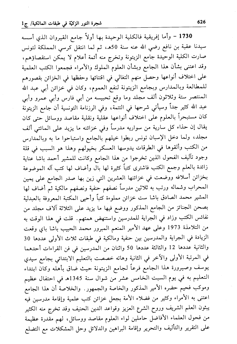 1730 - وأما إفريقية فالكلية الوحيدة بها أولاً جامع القيروان الذي أسسه سيدنا عقبة بن نافع رضي الله عنه سنة 50 هـ، ثم لما انتقل كرسي المملكة لتونس صارت الكلية الوحيدة جامع الزيتونة وتخرج منه أئمة أعلام لا يمكن استقصاؤهم، وقد اعتنى بشأن هذا الجامع وبشأن العلوم الملوك والأمراء فجمعوا الكتب العلمية على اختلاف أنواعها وحصل منهم التغالي في اقتنائها وحفظها في الخزائن بقصورهم للمطالعة وبالمدارس وبجامع الزيتونة لنفع العموم، وكان في خزائن أبي عبد الله المنتصر ستة وثلاثون ألف مجلد وما وقع تحبيسه من أبي فارس وأبي عمرو وأبي عبد الله كثير جداً وسيأتي شرحها في التتمة، وفي الرزنامة التونسية أن جامع الزيتونة كان مستبحراً بالعلوم على اختلاف أنواعها عقلية ونقلية مقاصد ووسائل حتى كان يقال إن حذاء كل سارية من سواريه مدرساً وفي خزائنه ما يزيد على المائتي ألف مجلد، ولما دخل الإسبان تونس ربطوا خيلهم بالجامع وأستباحوا ما به وبالمدارس من الكتب وألقوها في الطرقات يدوسها العسكر بخيولهم وهذا هو السبب في قلة وجود تآليف الفحول الذين تخرجوا من هذا الجامع وكانت للمشير أحمد باشا عناية زائدة بالعلم وجمع الكتب فاشترى كتباً كثيرة لها بال وأضاف لها كتب آله الموضوعة بخزائن أسلافه ووضعت في خزائنها العشرين التي زين بها صدر الجامع على يمين المحراب وشماله ورتب به ثلاثين مدرساً نصفهم حنفية ونصفهم مالكية ثم أضاف لها المشير محمَّد الصادق باشا ست خزائن مملوءة كتباً وأحيى المكتبة المعروفة بالعبدلية بصحن الجنائز من الجامع المذكور ووضع فيها ما يزيد على الثلاثة آلاف مجلد من نفائس الكتب وزاد في الجراية للمدرسين واستنهض همتهم. قلت في هذا الوقت به من التلامذة 1973 وعلى عهد الأمير المنعم المبرور محمَّد الحبيب باشا باي وقعت الزيادة في الجراية والمدرسين بين حنفية ومالكية في طبقات ثلاث الأولى عددها 30 والثانية عددها 12 والثالثة عددها 50 واثنان من المدرسين في فن القراءات أحدهما في المرتبة الأولى والآخر في الثانية وهاته خصصت بالتعليم الابتدائي بجامع سيدي يوسف وصيرورة هذا الجامع فرعاً لجامع الزيتونة حيث ضاق بأهله وكان ابتداء التعليم به في يوم السبت الخامس عشر من شوال سنة 1345 هـ في احتفال عظيم وموكب فحيم حضره الأمير المذكور والخاصة والجمهور. والخلاصة أن هذا الجامع اعتنى به الأمراء وكثير من فضلاء الأمة بجعل خزائن كتب علمية وإقامة مدرسين فيه يبثون العلم الشريف وروح الشرع العزيز وقواعد الدين الحنيف وقد تخرج منه الكثير من فحول العلماء الأفاضل حاملين لواء العلوم مقاصد ووسائل، لهم مقدرة عظيمة على التقرير والتأليف والتحرير وإقامة البراهين والدلائل وحل المشكلات مع التضلع