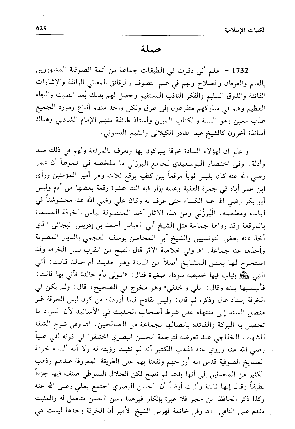 1732 - اعلم أني ذكرت في الطبقات جماعة من أئمة الصوفية المشهورين بالعلم والعرفان والصلاح ولهم في علم التصوف والرقائق المعاني الرائقة والإشارات الفائقة والذوق السليم والفكر الثاقب المستقيم وحصل لهم بذلك بُعد الصيت والجاه العظيم وهم في سلوكهم متفرعون إلى طرق ولكل واحد منهم أتباع ومورد الجميع عذب معين وهو السنة والكتاب المبين وأستاذ طائفة منهم الإِمام الشاذلي وهناك أساتذة آخرون كالشيخ عبد القادر الكيلاني والشيخ الدسوقي.