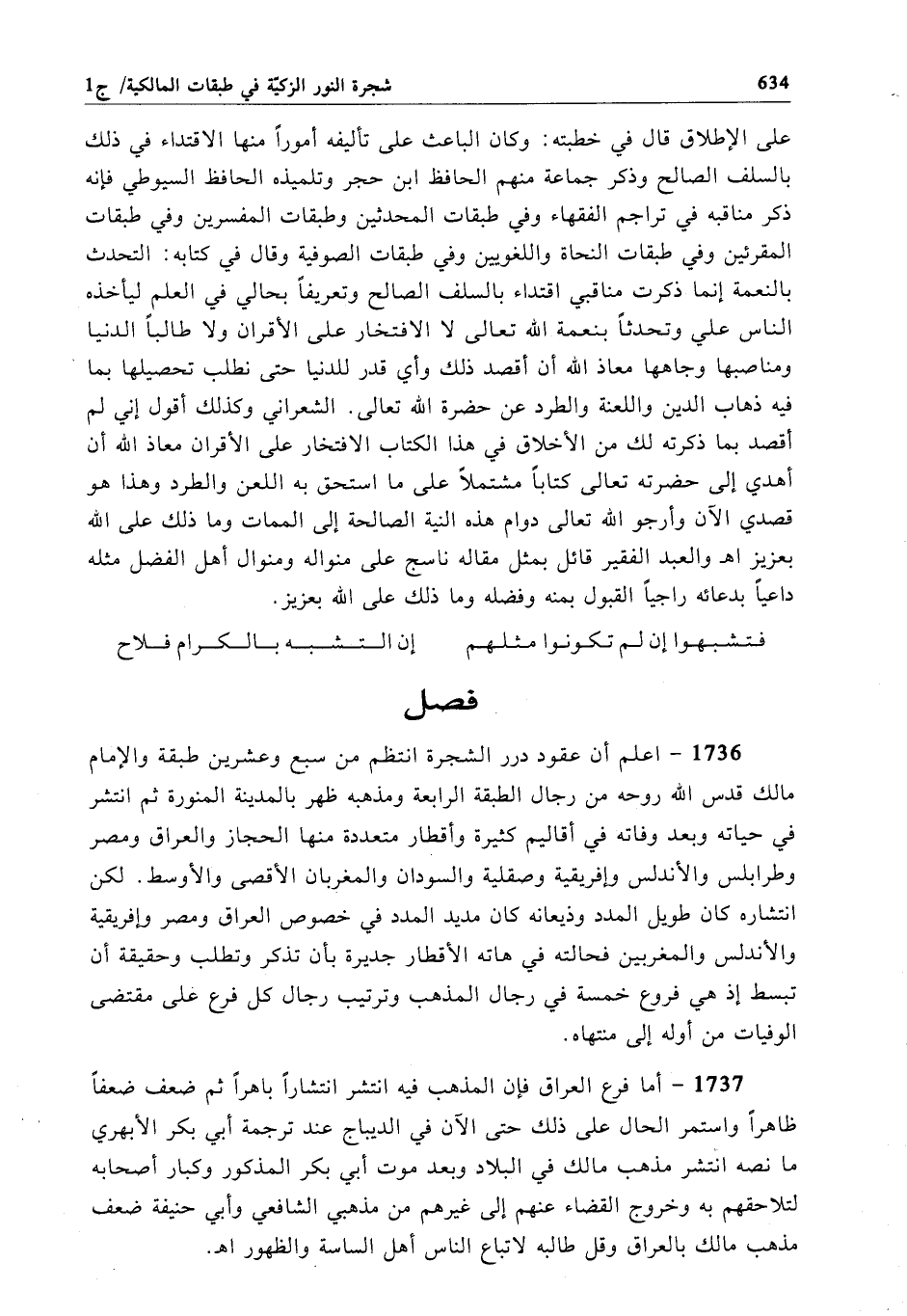 1736 - اعلم أن عقود درر الشجرة انتظم من سبع وعشرين طبقة والإمام مالك قدس الله روحه من رجال الطبقة الرابعة ومذهبه ظهر بالمدينة المنورة ثم انتشر في حياته وبعد وفاته في أقاليم كثيرة وأقطار متعددة منها الحجاز والعراق ومصر وطرابلس والأندلس وإفريقية وصقلية والسودان والمغربان الأقصى والأوسط. لكن انتشاره كان طويل المدد وذيعانه كان مديد المدد في خصوص العراق ومصر وإفريقية والأندلس والمغربين فحالته في هاته الأقطار جديرة بأن تذكر وتطلب وحقيقة أن تبسط إذ هي فروع خمسة في رجال المذهب وترتيب رجال كل فرع على مقتضى الوفيات من أوله إلى منتهاه.