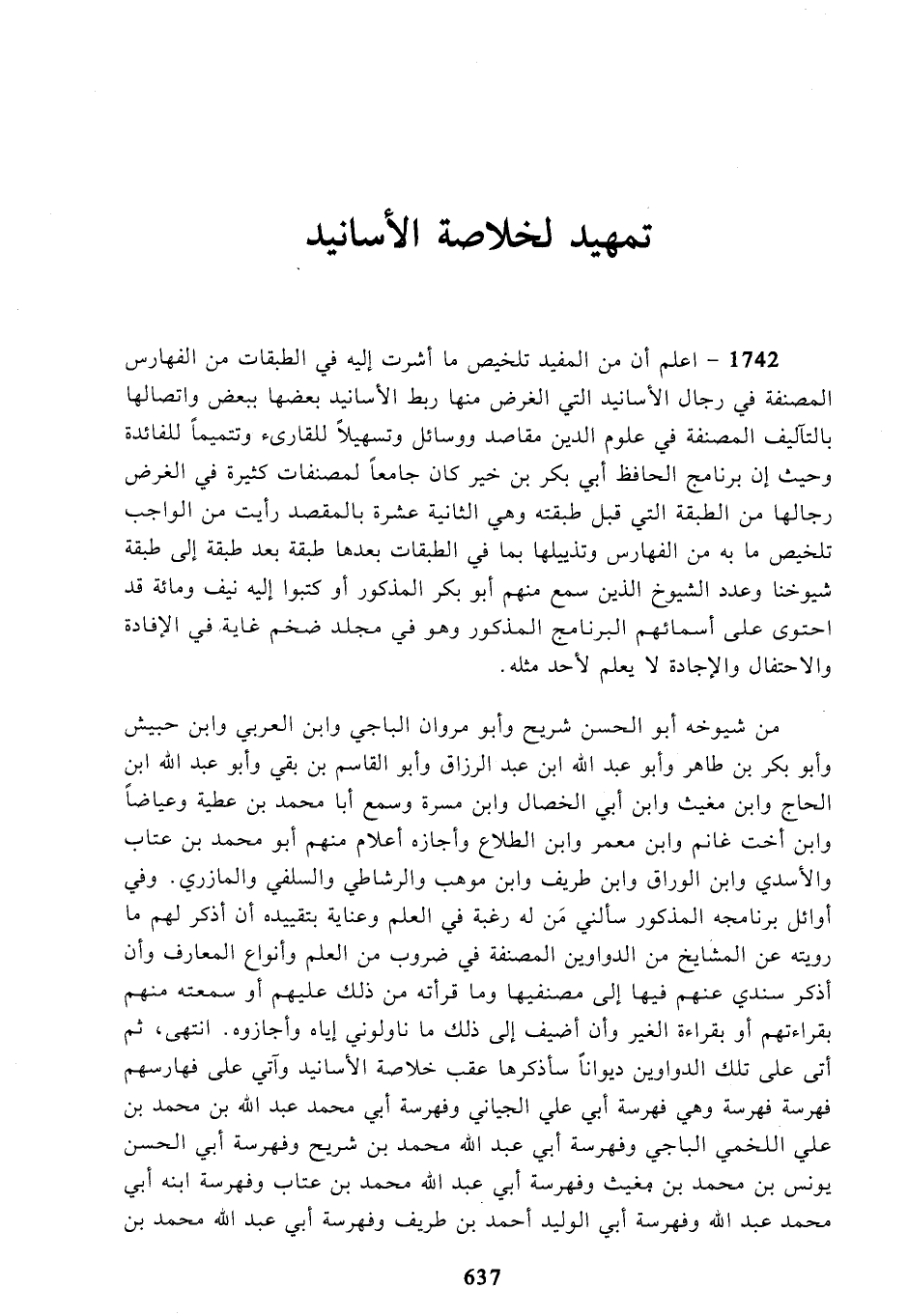 1742 - اعلم أن من المفيد تلخيص ما أشرت إليه في الطبقات من الفهارس المصنفة في رجال الأسانيد التي الغرض منها ربط الأسانيد بعضها ببعض واتصالها بالتآليف المصنفة في علوم الدين مقاصد ووسائل وتسهيلاً للقارىء وتتميماً للفائدة وحيث إن برنامج الحافظ أبي بكر بن خير كان جامعاً لمصنفات كثيرة في الغرض رجالها من الطبقة التي قبل طبقته وهي الثانية عشرة بالمقصد رأيت من الواجب تلخيص ما به من الفهارس وتذييلها بما في الطبقات بعدها طبقة بعد طبقة إلى طبقة شيوخنا وعدد الشيوخ الذين سمع منهم أبو بكر المذكور أو كتبوا إليه نيف ومائة قد احتوى على أسمائهم البرنامج المذكور وهو في مجلد ضخم غاية في الإفادة والاحتفال والإجادة لا يعلم لأحد مثله.