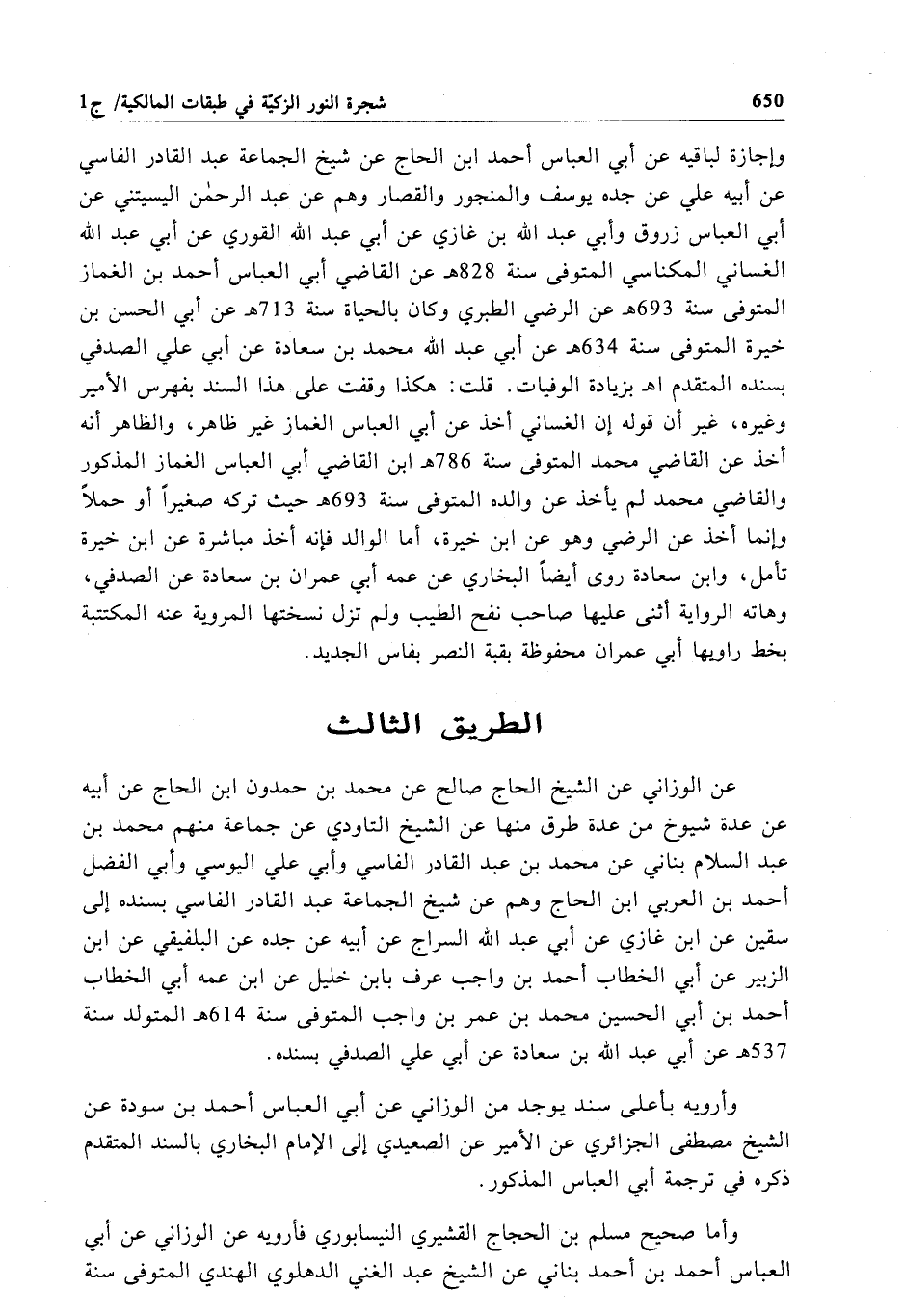 عن الوزاني عن الشيخ الحاج صالح عن محمَّد بن حمدون ابن الحاج عن أبيه عن عدة شيوخ من عدة طرق منها عن الشيخ التاودي عن جماعة منهم محمَّد بن عبد السلام بناني عن محمَّد بن عبد القادر الفاسي وأبي علي اليوسي وأبي الفضل أحمد بن العربي ابن الحاج وهم عن شيخ الجماعة عبد القادر الفاسي بسنده إلى سقين عن ابن غازي عن أبي عبد الله السراج عن أبيه عن جده عن البلفيقي عن ابن الزبير عن أبي الخطاب أحمد بن واجب عرف بابن خليل عن ابن عمه أبي الخطاب أحمد بن أبي الحسين محمَّد بن عمر بن واجب المتوفى سنة 614 هـ المتولد سنة 537 هـ عن أبي عبد الله بن سعادة عن أبي علي الصدفي بسنده.