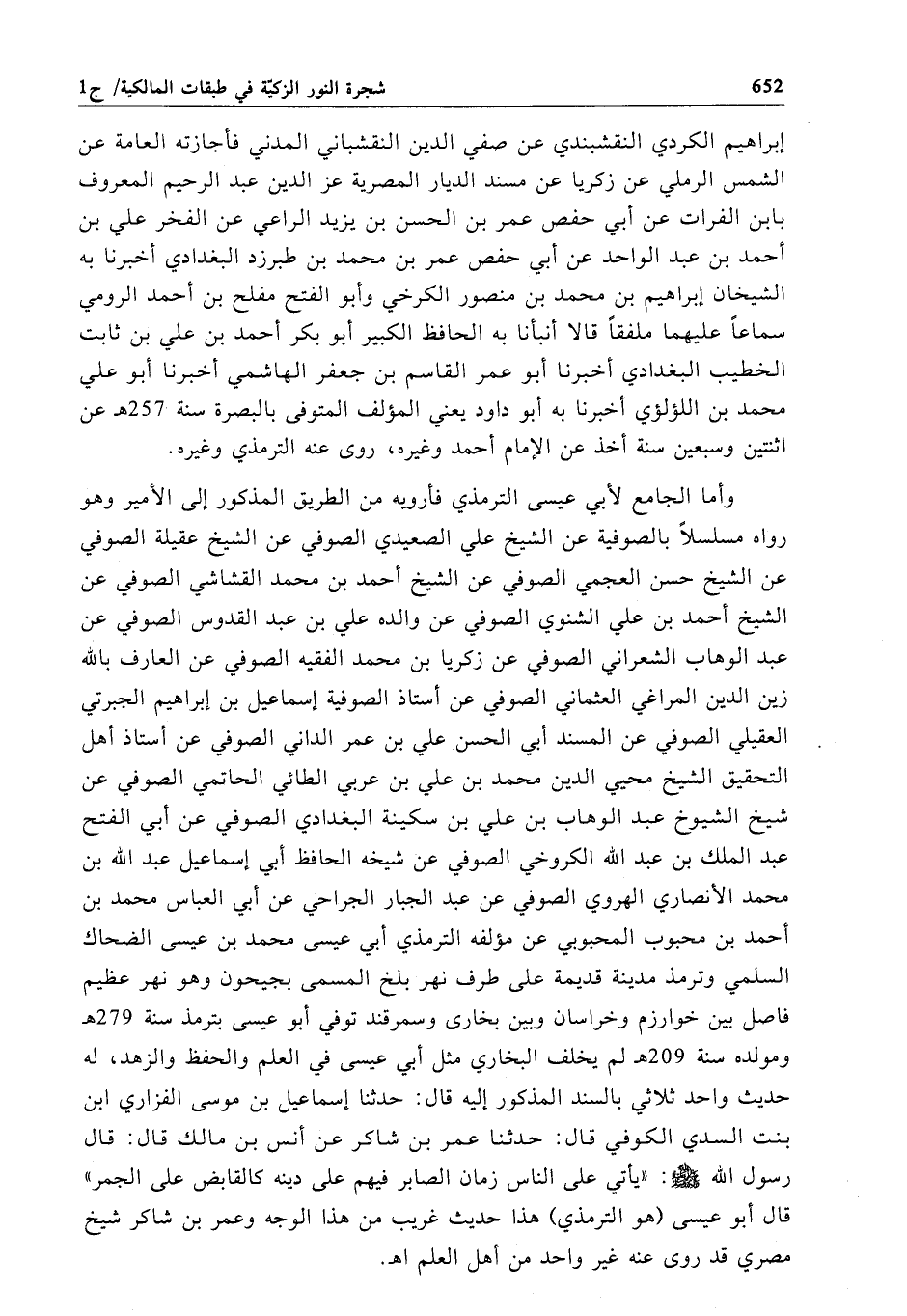 وأما الجامع لأبي عيسى الترمذي فأرويه من الطريق المذكور إلى الأمير وهو رواه مسلسلاً بالصوفية عن الشيخ علي الصعيدي الصوفي عن الشيخ عقيلة الصوفي عن الشيخ حسن العجمي الصوفي عن الشيخ أحمد بن محمَّد القشاشي الصوفي عن الشيخ أحمد بن علي الشنوي الصوفي عن والده علي بن عبد القدوس الصوفي عن عبد الوهاب الشعراني الصوفي عن زكريا بن محمَّد الفقيه الصوفي عن العارف بالله زين الدين المراغي العثماني الصوفي عن أستاذ الصوفية إسماعيل بن إبراهيم الجبرتي العقيلي الصوفي عن المسند أبي الحسن علي بن عمر الداني الصوفي عن أستاذ أهل التحقيق الشيخ محيي الدين محمَّد بن علي بن عربي الطائي الحاتمي الصوفي عن شيخ الشيوخ عبد الوهاب بن علي بن سكينة البغدادي الصوفي عن أبي الفتح عبد الملك بن عبد الله الكروخي الصوفي عن شيخه الحافظ أبي إسماعيل عبد الله بن محمَّد الأنصاري الهروي الصوفي عن عبد الجبار الجراحي عن أبي العباس محمَّد بن أحمد بن محبوب المحبوبي عن مؤلفه الترمذي أبي عيسى محمَّد بن عيسى الضحاك السلمي وترمذ مدينة قديمة على طرف نهر بلخ المسمى بجيحون وهو نهر عظيم فاصل بين خوارزم وخراسان وبين بخارى وسمرقند توفي أبو عيسى بترمذ سنة 279 هـ ومولده سنة 209هـ لم يخلف البخاري مثل أبي عيسى في العلم والحفظ والزهد، له حديث واحد ثلاثي بالسند المذكور إليه قال: حدثنا إسماعيل بن موسى الفزاري ابن بنت السدي الكوفي قال: حدثنا عمر بن شاكر عن أنس بن مالك قال: قال رسول الله - صلى الله عليه وسلم -: "يأتي على الناس زمان الصابر فيهم على دينه كالقابض على الجمر" قال أبو عيسى (هو الترمذي) هذا حديث غريب من هذا الوجه وعمر بن شاكر شيخ مصري قد روى عنه غير واحد من أهل العلم اهـ.