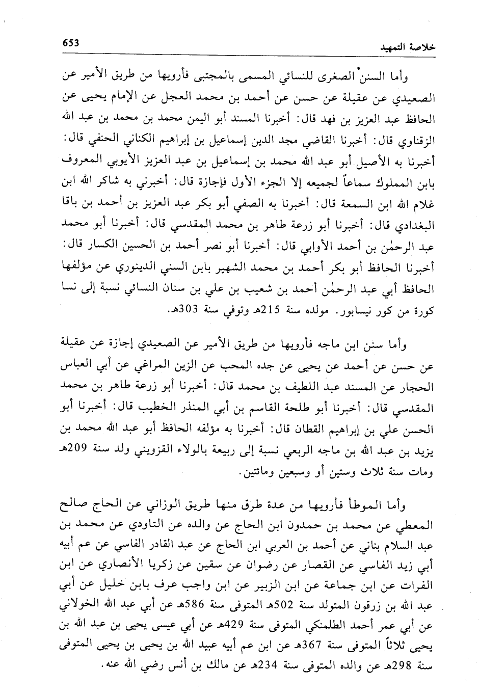 وأما سنن ابن ماجه فأرويها من طريق الأمير عن الصعيدي إجازة عن عقيلة عن حسن عن أحمد عن يحيى عن جده المحب عن الزين المراغي عن أبي العباس الحجار عن المسند عبد اللطيف بن محمَّد قال: أخبرنا أبو زرعة طاهر بن محمَّد المقدسي قال: أخبرنا أبو طلحة القاسم بن أبي المنذر الخطيب قال: أخبرنا أبو الحسن علي بن إبراهيم القطان قال: أخبرنا به مؤلفه الحافظ أبو عبد الله محمَّد بن يزيد بن عبد الله بن ماجه الربعي نسبة إلى ربيعة بالولاء القزويني ولد سنة 209 هـ ومات سنة ثلاث وستين أو وسبعين ومائتين.
