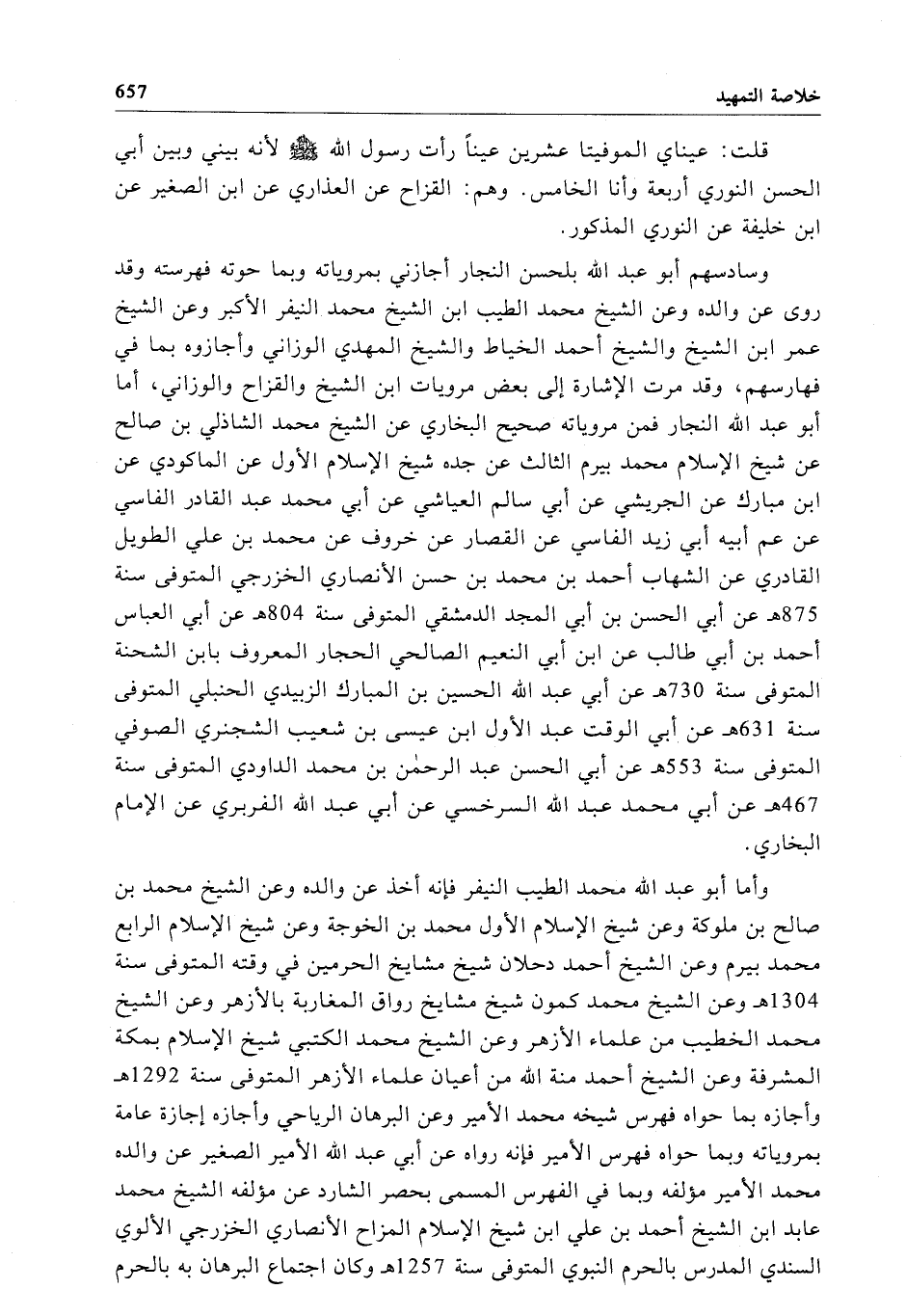 وسادسهم أبو عبد الله بلحسن النجار أجازني بمروياته وبما حوته فهرسته وقد روى عن والده وعن الشيخ محمَّد الطيب ابن الشيخ محمَّد النيفر الأكبر وعن الشيخ عمر ابن الشيخ والشيخ أحمد الخياط والشيخ المهدي الوزاني وأجازوه بما في فهارسهم، وقد مرت الإشارة إلى بعض مرويات ابن الشيخ والقزاح والوزاني، أما أبو عبد الله النجار فمن مروياته صحيح البخاري عن الشيخ محمَّد الشاذلي بن صالح عن شيخ الإِسلام محمَّد بيرم الثالث عن جده شيخ الإِسلام الأول عن الماكودي عن ابن مبارك عن الجريشي عن أبي سالم العياشي عن أبي محمَّد عبد القادر الفاسي عن عم أبيه أبي زيد الفاسي عن القصار عن خروف عن محمَّد بن علي الطويل القادري عن الشهاب أحمد بن محمَّد بن حسن الأنصاري الخزرجي المتوفى سنة 875 هـ عن أبي الحسن بن أبي المجد الدمشقي المتوفى سنة 804 هـ عن أبي العباس أحمد بن أبي طالب عن ابن أبي النعيم الصالحي الحجار المعروف بابن الشحنة المتوفى سنة 730 هـ عن أبي عبد الله الحسين بن المبارك الزبيدي الحنبلي المتوفى سنة 631 هـ عن أبي الوقت عبد الأول ابن عيسى بن شعيب الشجنري الصوفي المتوفى سنة 553 هـ عن أبي الحسن عبد الرحمن بن محمَّد الداودي المتوفى سنة 467 هـ عن أبي محمَّد عبد الله السرخسي عن أبي عبد الله الفربري عن الإِمام البخاري.