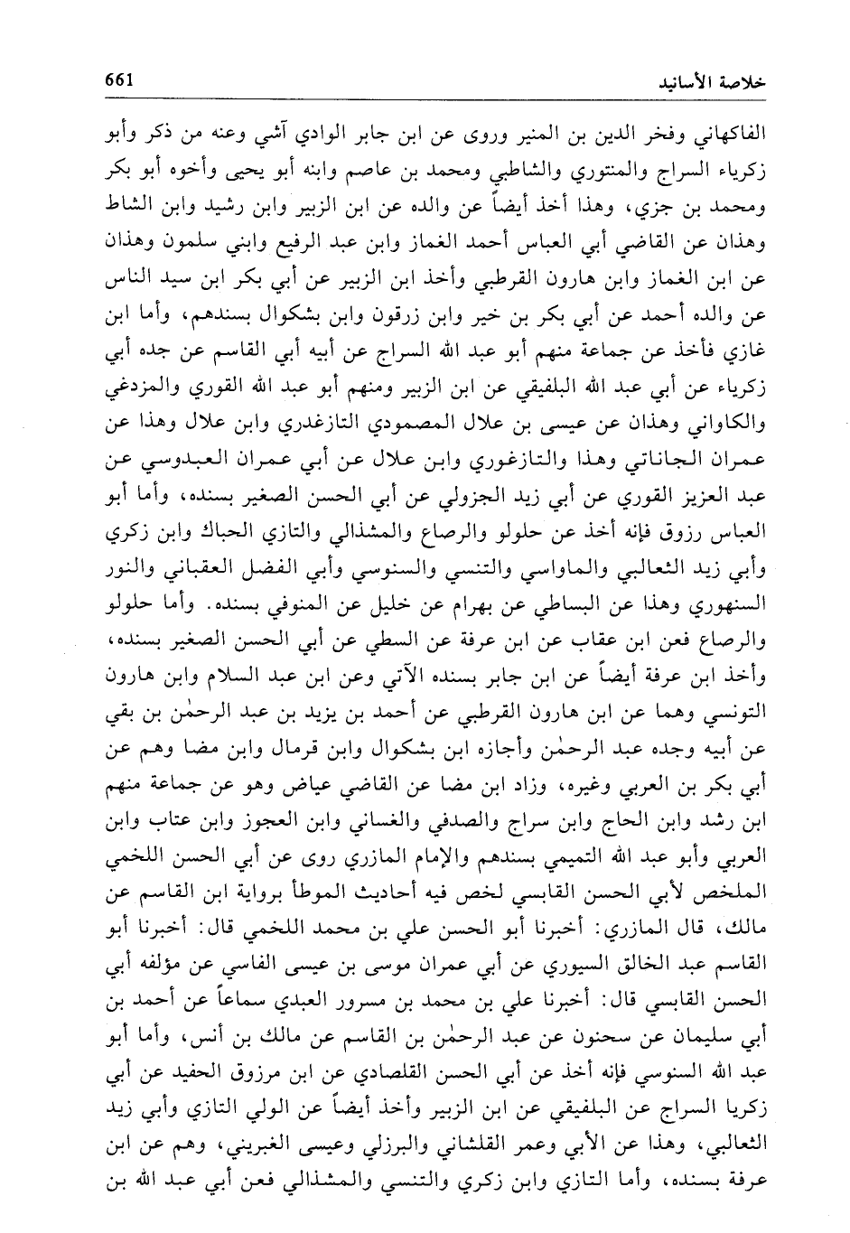 الفاكهاني وفخر الدين بن المنير وروى عن ابن جابر الوادي آشي وعنه من ذكر وأبو زكرياء السراج والمنتوري والشاطبي ومحمد بن عاصم وابنه أبو يحيي وأخوه أبو بكر ومحمد بن جزي، وهذا أخذ أيضاً عن والده عن ابن الزبير وابن رشيد وابن الشاط وهذان عن القاضي أبي العباس أحمد الغماز وابن عبد الرفيع وابني سلمون وهذان عن ابن الغماز وابن هارون القرطبي وأخذ ابن الزبير عن أبي بكر ابن سيد الناس عن والده أحمد عن أبي بكر بن خير وابن زرقون وابن بشكوال بسندهم، وأما ابن غازي فأخذ عن جماعة منهم أبو عبد الله السراج عن أبيه أبي القاسم عن جده أبي زكرياء عن أبي عبد الله البلفيقي عن ابن الزبير ومنهم أبو عبد الله القوري والمزدغي والكاواني وهذان عن عيسى بن علال المصمودي التازغدري وابن علال وهذا عن عمران الجاناتي وهذا والتازغوري وابن علال عن أبي عمران العبدوسي عن عبد العزيز القوري عن أبي زيد الجزولي عن أبي الحسن الصغير بسنده، وأما أبو العباس رزوق فإنه أخذ عن حلولو والرصاع والمشذالي والتازي الحباك وابن زكري وأبي زيد الثعالبي والماواسي والتنسي والسنوسي وأبي الفضل العقباني والنور السنهوري وهذا عن البساطي عن بهرام عن خليل عن المنوفي بسنده. وأما حلولو والرصاع فعن ابن عقاب عن ابن عرفة عن السطي عن أبي الحسن الصغير بسنده، وأخذ ابن عرفة أيضاً عن ابن جابر بسنده الآتي وعن ابن عبد السلام وابن هارون التونسي وهما عن ابن هارون القرطبي عن أحمد بن يزيد بن عبد الرحمن بن بقي عن أبيه وجده عبد الرحمن وأجازه ابن بشكوال وابن قرمال وابن مضا وهم عن أبي بكر بن العربي وغيره، وزاد ابن مضا عن القاضي عياض وهو عن جماعة منهم ابن رشد وابن الحاج وابن سراج والصدفي والغساني وابن العجوز وابن عتاب وابن العربي وأبو عبد الله التميمي بسندهم والإمام المازري روى عن أبي الحسن اللخمي الملخص لأبي الحسن القابسي لخص فيه أحاديث الموطأ برواية ابن القاسم عن مالك، قال المازري: أخبرنا أبو الحسن علي بن محمَّد اللخمي قال: أخبرنا أبو القاسم عبد الخالق السيوري عن أبي عمران موسى بن عيسى الفاسي عن مؤلفه أبي الحسن القابسي قال: أخبرنا علي بن محمَّد بن مسرور العبدي سماعاً عن أحمد بن أبي سليمان عن سحنون عن عبد الرحمن بن القاسم عن مالك بن أنس، وأما أبو عبد الله السنوسي فإنه أخذ عن أبي الحسن القلصادي عن ابن مرزوق الحفيد عن أبي زكريا السراج عن البلفيقي عن ابن الزبير وأخذ أيضاً عن الولي التازي وأبي زيد الثعالبي، وهذا عن الأبي وعمر القلشاني والبرزلي وعيسى الغبريني، وهم عن ابن عرفة بسنده، وأما التازي وابن زكري والتنسي والمشذالي فعن أبي عبد الله بن