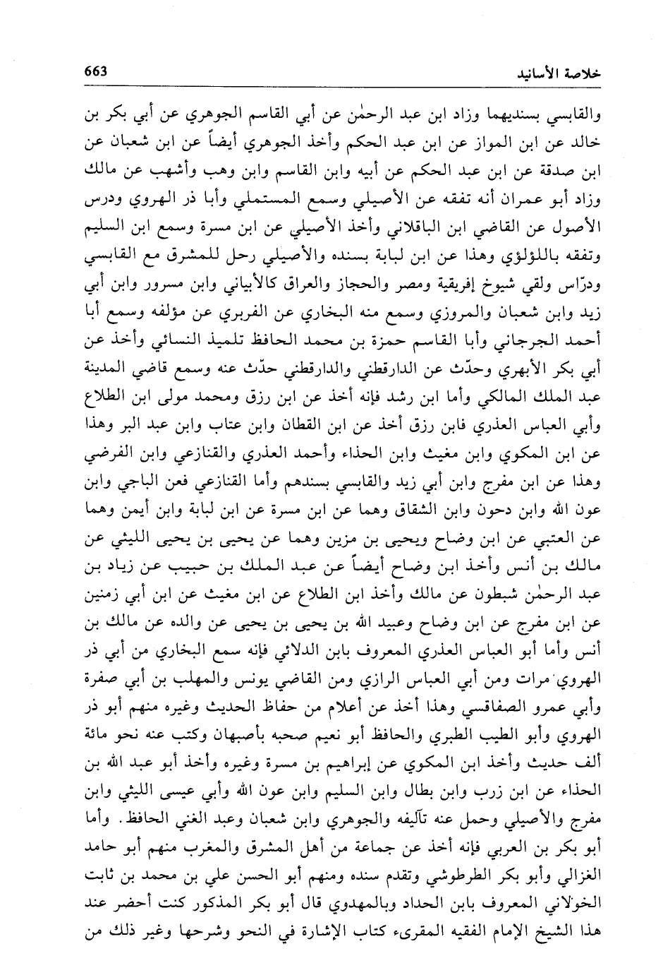 والقابسي بسنديهما وزاد ابن عبد الرحمن عن أبي القاسم الجوهري عن أبي بكر بن خالد عن ابن المواز عن ابن عبد الحكم وأخذ الجوهري أيضاً عن ابن شعبان عن ابن صدقة عن ابن عبد الحكم عن أبيه وابن القاسم وابن وهب وأشهب عن مالك وزاد أبو عمران أنه تفقه عن الأصيلي وسمع المستملي وأبا ذر الهروي ودرس الأصول عن القاضي ابن الباقلاني وأخذ الأصيلي عن ابن مسرة وسمع ابن السليم وتفقه باللؤلؤي وهذا عن ابن لبابة بسنده والأصيلي رحل للمشرق مع القابسي ودرّاس ولقي شيوخ إفريقية ومصر والحجاز والعراق كالأبياني وابن مسرور وابن أبي زيد وابن شعبان والمروزي وسمع منه البخاري عن الفربري عن مؤلفه وسمع أبا أحمد الجرجاني وأبا القاسم حمزة بن محمَّد الحافظ تلميذ النسائي وأخذ عن أبي بكر الأبهري وحدّث عن الدارقطني والدارقطني حدّث عنه وسمع قاضي المدينة عبد الملك المالكي وأما ابن رشد فإنه أخذ عن ابن رزق ومحمد مولى ابن الطلاع وأبي العباس العذري فابن رزق أخذ عن ابن القطان وابن عتاب وابن عبد البر وهذا عن ابن المكوي وابن مغيث وابن الحذاء وأحمد العذري والقنازعي وابن الفرضي وهذا عن ابن مفرج وابن أبي زيد والقابسي بسندهم وأما القنازعي فعن الباجي وابن عون الله وابن دحون وابن الشقاق وهما عن ابن مسرة عن ابن لبابة وابن أيمن وهما عن العتبي عن ابن وضاح ويحيى بن مزين وهما عن يحيى بن يحيى الليثي عن مالك بن أنس وأخذ ابن وضاح أيضاً عن عبد الملك بن حبيب عن زياد بن عبد الرحمن شبطون عن مالك وأخذ ابن الطلاع عن ابن مغيث عن ابن أبي زمنين عن ابن مفرج عن ابن وضاح وعبيد الله بن يحيى بن يحيى عن والده عن مالك بن أنس وأما أبو العباس العذري المعروف بابن الدلائي فإنه سمع البخاري من أبي ذر الهروي مرات ومن أبي العباس الرازي ومن القاضي يونس والمهلب بن أبي صفرة وأبي عمرو الصفاقسي وهذا أخذ عن أعلام من حفاظ الحديث وغيره منهم أبو ذر الهروي وأبو الطيب الطبري والحافظ أبو نعيم صحبه بأصبهان وكتب عنه نحو مائة ألف حديث وأخذ ابن المكوي عن إبراهيم بن مسرة وغيره وأخذ أبو عبد الله بن الحذاء عن ابن زرب وابن بطال وابن السليم وابن عون الله وأبي عيسى الليثي وابن مفرج والأصيلي وحمل عنه تآليفه والجوهري وابن شعبان وعبد الغني الحافظ. وأما أبو بكر بن العربي فإنه أخذ عن جماعة من أهل المشرق والمغرب منهم أبو حامد الغزالي وأبو بكر الطرطوشي وتقدم سنده ومنهم أبو الحسن علي بن محمَّد بن ثابت الخؤلاني المعروف بابن الحداد وبالمهدوي قال أبو بكر المذكور كنت أحضر عند هذا الشيخ الإِمام الفقيه المقرئ كتاب الإشارة في النحو وشرحها وغير ذلك من