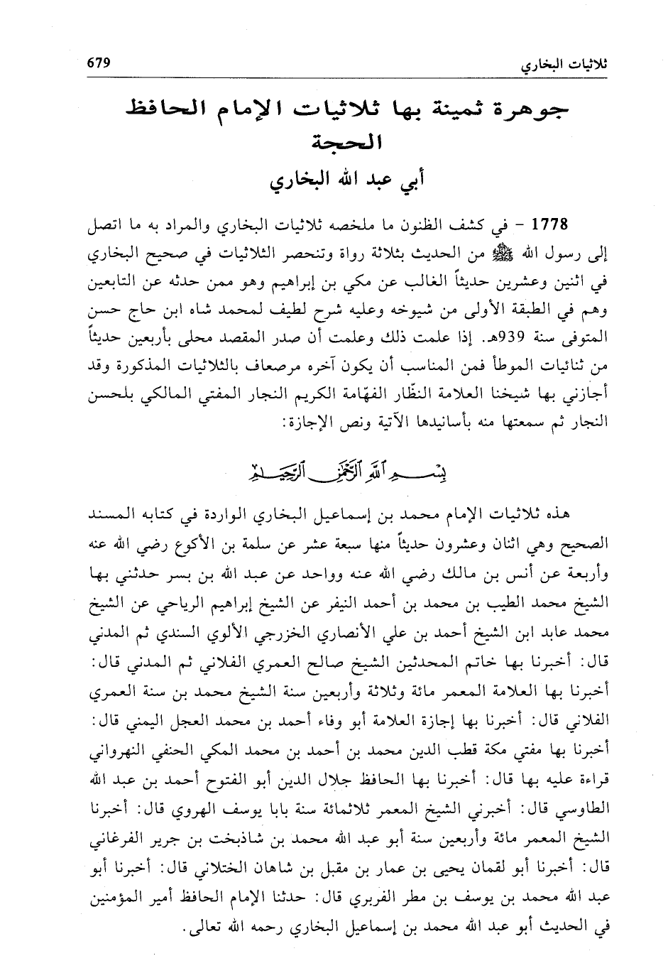 1778 - في كشف الظنون ما ملخصه ثلاثيات البخاري والمراد به ما اتصل إلى رسول الله - صلى الله عليه وسلم - من الحديث بثلاثة رواة وتنحصر الثلاثيات في صحيح البخاري في اثنين وعشرين حديثاً الغالب عن مكي بن إبراهيم وهو ممن حدثه عن التابعين وهم في الطبقة الأولى من شيوخه وعليه شرح لطيف لمحمد شاه ابن حاج حسن المتوفى سنة 939 هـ. إذا علمت ذلك وعلمت أن صدر المقصد محلى بأربعين حديثاً من ثنائيات الموطأ فمن المناسب أن يكون آخره مرصعاف بالثلاثيات المذكورة وقد أجازني بها شيخنا العلامة النظّار الفهّامة الكريم النجار المفتي المالكي بلحسن النجار ثم سمعتها منه بأسانيدها الآتية ونص الإجازة: