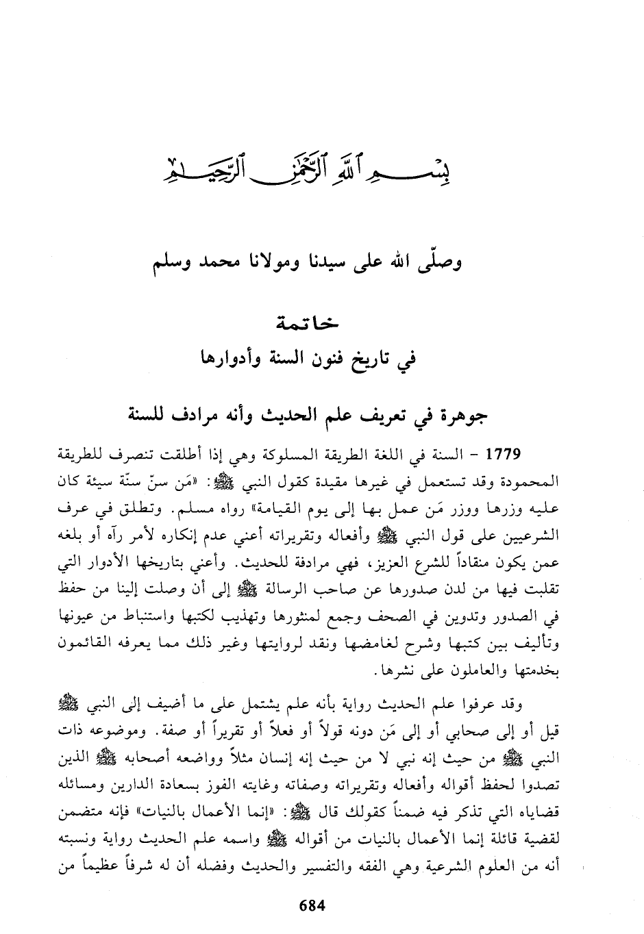 1779 - السنة في اللغة الطريقة المسلوكة وهي إذا أطلقت تنصرف للطريقة المحمودة وقد تستعمل في غيرها مقيدة كقول النبي - صلى الله عليه وسلم - ـ: "مَن سنّ سنّة سيئة كان عليه وزرها ووزر مَن عمل بها إلى يوم القيامة" رواه مسلم. وتطلق في عرف الشرعيين على قول النبي - صلى الله عليه وسلم - وأفعاله وتقريراته أعني عدم إنكاره لأمر رآه أو بلغه عمن يكون منقاداً للشرع العزيز، فهي مرادفة للحديث. وأعني بتاريخها الأدوار التي تقلبت فيها من لدن صدورها عن صاحب الرسالة - صلى الله عليه وسلم - إلى أن وصلت إلينا من حفظ في الصدور وتدوين في الصحف وجمع لمنثورها وتهذيب لكتبها واستنباط من عيونها وتأليف بين كتبها وشرح لغامضها ونقد لروايتها وغير ذلك مما يعرفه القائمون بخدمتها والعاملون على نشرها.