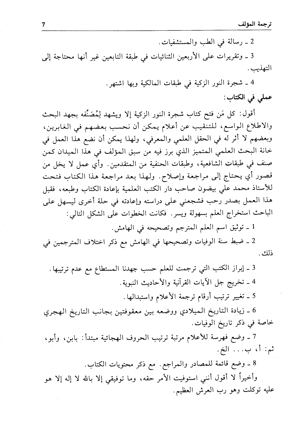 أقول: كل مَن فتح كتاب شجرة النور الزكية إلا ويشهد لِمُصَنِّفه بجهد البحث والاطلاع الواسع، للتنقيب عن أعلام يمكن أن نحسب بعضهم في الغابرين، وبعضهم لا أثر له في الحقل العلمي والمعرفي، ولهذا يمكن أن نضع هذا العمل في خانة البحث العلمي المتميز الذي برز فيه من سبق المؤلف في هذا الميدان كمن صنف في طبقات الشافعية، وطبقات الحنفية من المتقدمين. وأي عمل لا يخل من قصور أي يحتاج إلى مراجعة وإصلاح. ولهذا بعد مراجعة هذا الكتاب فتحت للأستاذ محمَّد علي بيضون صاحب دار الكتب العلمية بإعادة الكتاب وطبعه، فقبل هذا العمل بصدر رحب فشجعني على دراسته وإعادته في حلة أخرى ليسهل على الباحث استخراج العلم بسهولة ويسر. فكانت الخطوات على الشكل التالي: