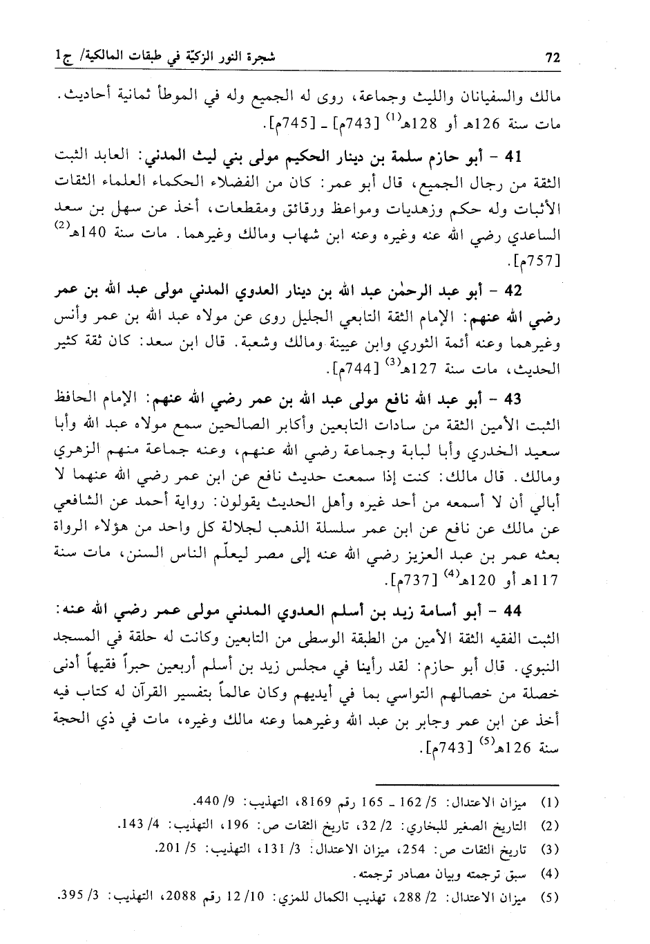 43 - أبو عبد الله نافع مولى عبد الله بن عمر رضي الله عنهم: الإِمام الحافظ الثبت الأمين الثقة من سادات التابعين وأكابر الصالحين سمع مولاه عبد الله وأبا سعيد الخدري وأبا لبابة وجماعة رضي الله عنهم، وعنه جماعة منهم الزهري ومالك. قال مالك: كنت إذا سمعتا حديث نافع عن ابن عمر رضي الله عنهما لا أبالي أن لا أسمعه من أحد غيره وأهل الحديث يقولون: رواية أحمد عن الشافعي عن مالك عن نافع عن ابن عمر سلسلة الذهب لجلالة كل واحد من هؤلاء الرواة بعثه عمر بن عبد العزيز رضي الله عنه إلى مصر ليعلّم الناس السنن, مات سنة 117هـ أو 120 هـ[737 م].