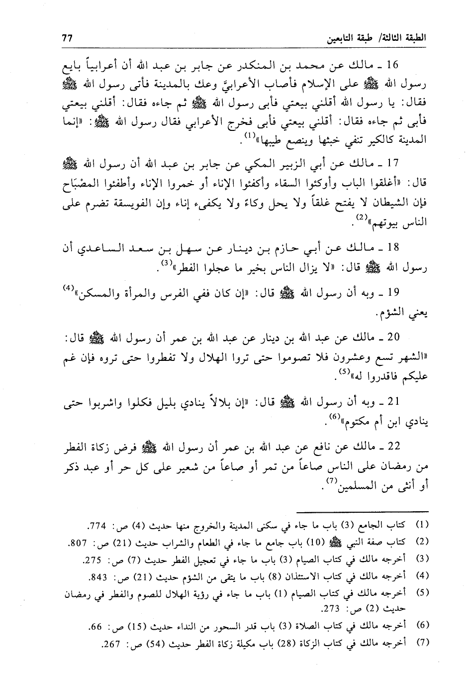 22 - مالك عن نافع عن عبد الله بن عمر أن رسول الله - صلى الله عليه وسلم - فرض زكاة الفطر من رمضان على الناس صاعاً من تمر أو صاعاً من شعير على كل حر أو عبد ذكر أو أنثى من المسلمين.