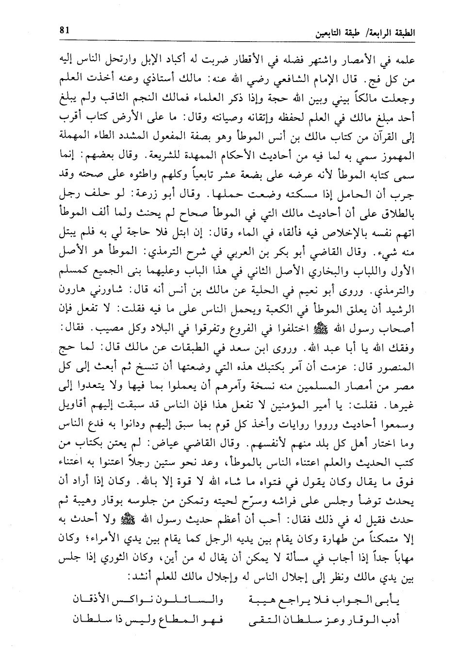 علمه في الأمصار واشتهر فضله في الأقطار ضربت له أكباد الإبل وارتحل الناس إليه من كل فج. قال الإِمام الشافعي رضي الله عنه: مالك أستاذي وعنه أخذت العلم وجعلت مالكاً بيني وبين الله حجة وإذا ذكر العلماء فمالك النجم الثاقب ولم يبلغ أحد مبلغ مالك في العلم لحفظه وإتقانه وصيانته وقال: ما على الأرض كتاب أقرب إلى القرآن من كتاب مالك بن أنس الموطأ وهو بصفة المفعول المشدد الطاء المهملة المهموز سمي به لما فيه من أحاديث الأحكام الممهدة للشريعة. وقال بعضهم: إنما سمى كتابه الموطأ لأنه عرضه على بضعة عشر تابعياً وكلهم واطئوه على صحته وقد جرب أن الحامل إذا مسكته وضعت حملها. وقال أبو زرعة: لو حلف رجل بالطلاق على أن أحاديث مالك التي في الموطأ صحاح لم يحنث ولما ألف الموطأ اتهم نفسه بالإخلاص فيه فألقاه في الماء وقال: إن ابتل فلا حاجة لي به فلم يبتل منه شيء. وقال القاضي أبو بكر بن العربي في شرح الترمذي: الموطأ هو الأصل الأول واللباب والبخاري الأصل الثاني في هذا الباب وعليهما بني الجميع كمسلم والترمذي. وروى أبو نعيم في الحلية عن مالك بن أنس أنه قال: شاورني هارون الرشيد أن يعلق الموطأ في الكعبة ويحمل الناس على ما فيه فقلت: لا تفعل فإن أصحاب رسول الله - صلى الله عليه وسلم - اختلفوا في الفروع وتفرقوا في البلاد وكل مصيب. فقال: وفقك الله يا أبا عبد الله. وروى ابن سعد في الطبقات عن مالك قال: لما حج المنصور قال: عزمت أن آمر بكتبك هذه التي وضعتها أن تنسخ ثم أبعث إلى كل مصر من أمصار المسلمين منه نسخة وآمرهم أن يعملوا بما فيها ولا يتعدوا إلى غيرها. فقلت: يا أمير المؤمنين لا تفعل هذا فإن الناس قد سبقت إليهم أقاويل وسمعوا أحاديث ورووا روايات وأخذ كل قوم بما سبق إليهم ودانوا به فدع الناس وما اختار أهل كل بلد منهم لأنفسهم. وقال القاضي عياض: لم يعتن بكتاب من كتب الحديث والعلم اعتناء الناس بالموطأ، وعد نحو ستين رجلاً اعتنوا به اعتناء فوق ما يقال وكان يقول في فتواه ما شاء الله لا قوة إلا بالله. وكان إذا أراد أن يحدث توضأ وجلس على فراشه وسرّح لحيته وتمكن من جلوسه بوقار وهيبة ثم حدث فقيل له في ذلك فقال: أحب أن أعظم حديث رسول الله - صلى الله عليه وسلم - ولا أحدث به إلا متمكناً من طهارة وكان يقام بين يديه الرجل كما يقام بين يدي الأمراء؛ وكان مهاباً جداً إذا أجاب في مسألة لا يمكن أن يقال له من أين، وكان الثوري إذا جلس بين يدي مالك ونظر إلى إجلال الناس له وإجلال مالك للعلم أنشد: