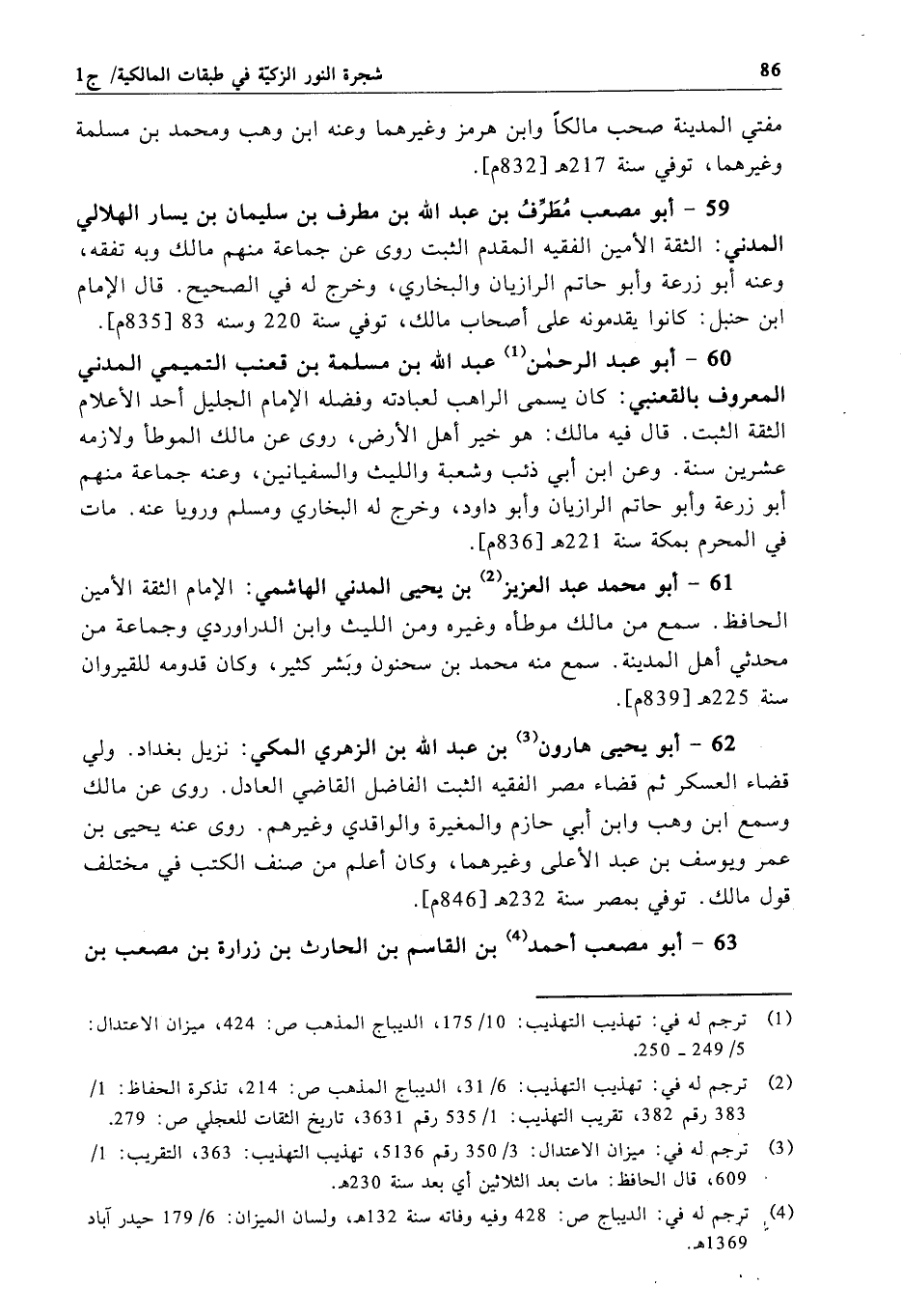 59 - أبو مصعب مُطَرِّفُ بن عبد الله بن مطرف بن سليمان بن يسار الهلالي المدني: الثقة الأمين الفقيه المقدم الثبت روى عن جماعة منهم مالك وبه تفقه، وعنه أبو زرعة وأبو حاتم الرازيان والبخاري، وخرج له في الصحيح. قال الإِمام ابن حنبل: كانوا يقدمونه على أصحاب مالك، توفي سنة 220 وسنه 83 [835م].